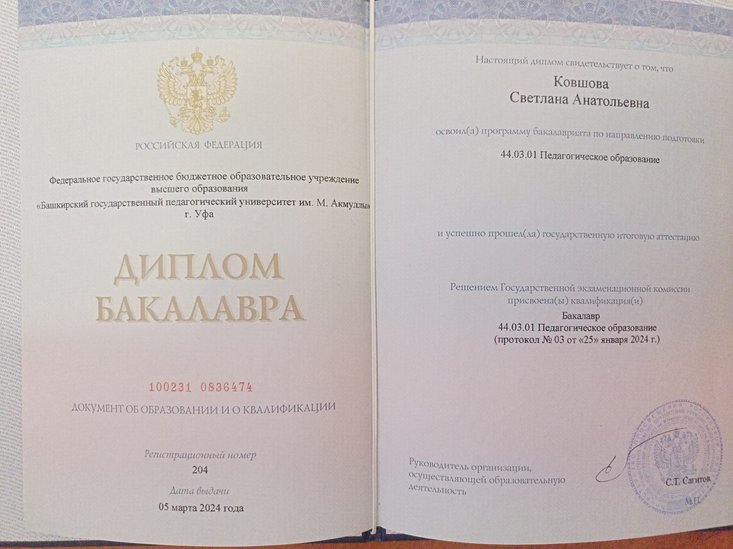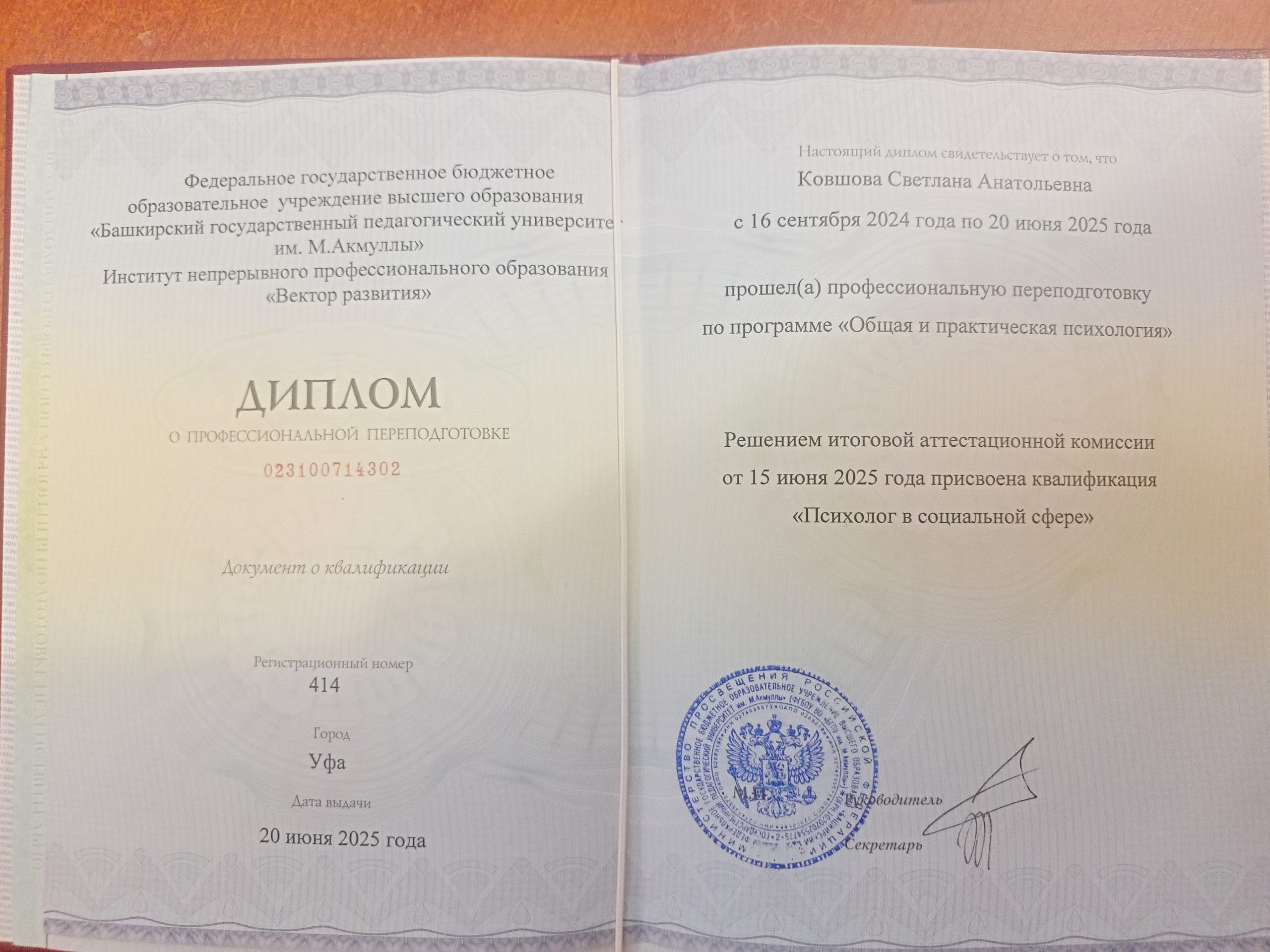 на базе высшего педагогического образования (БГПУ) там же прошла переподготовки "психолог в социальной сфере" и "детский и подростковый психолог".