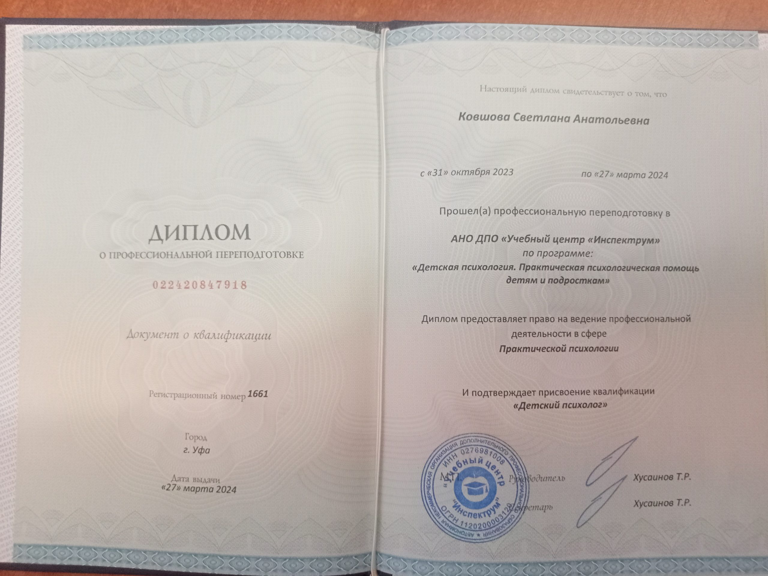 Диплом о профессиональной переподготовки с присвоением квалификации "детский и подростковый психолог"