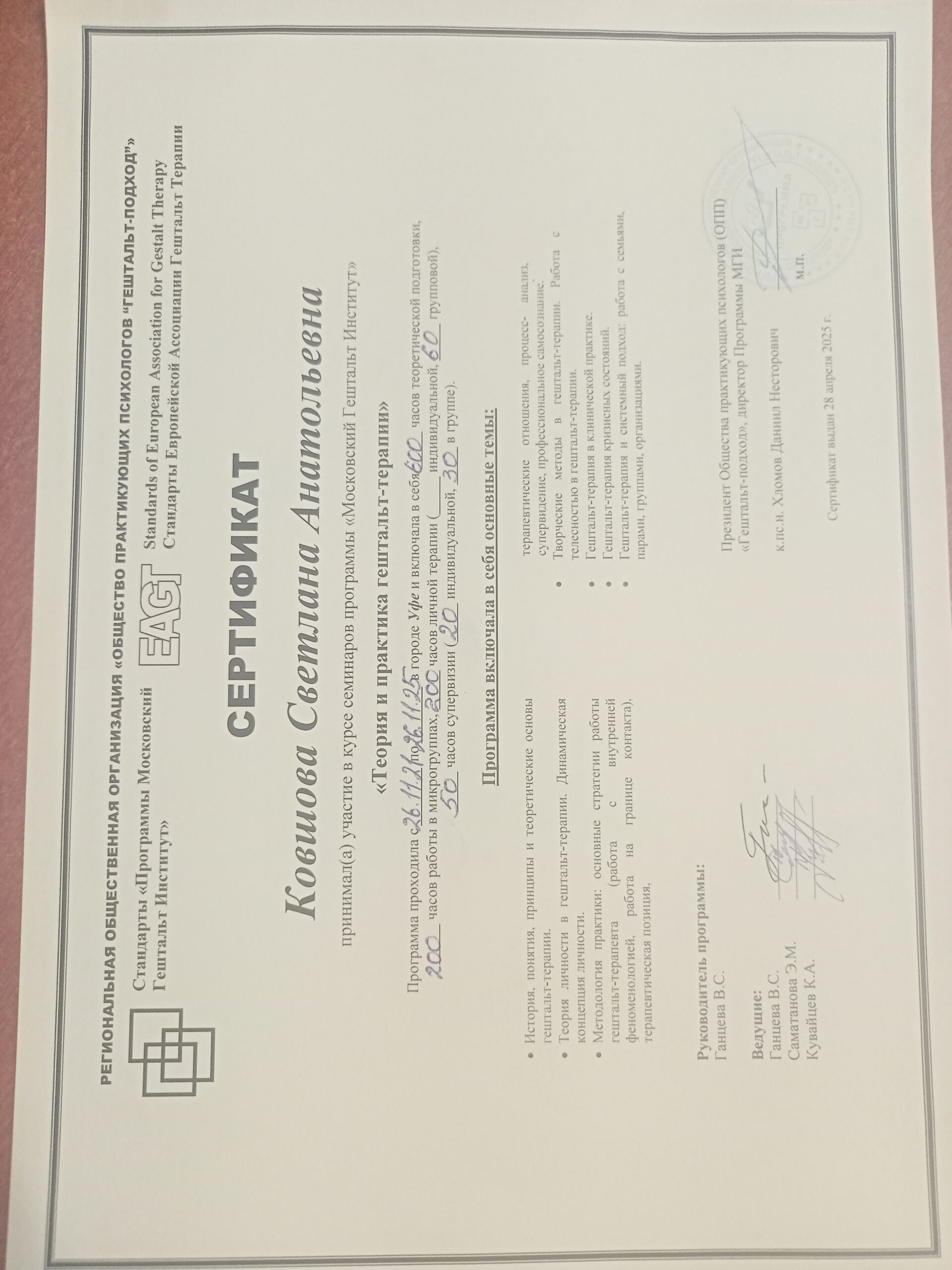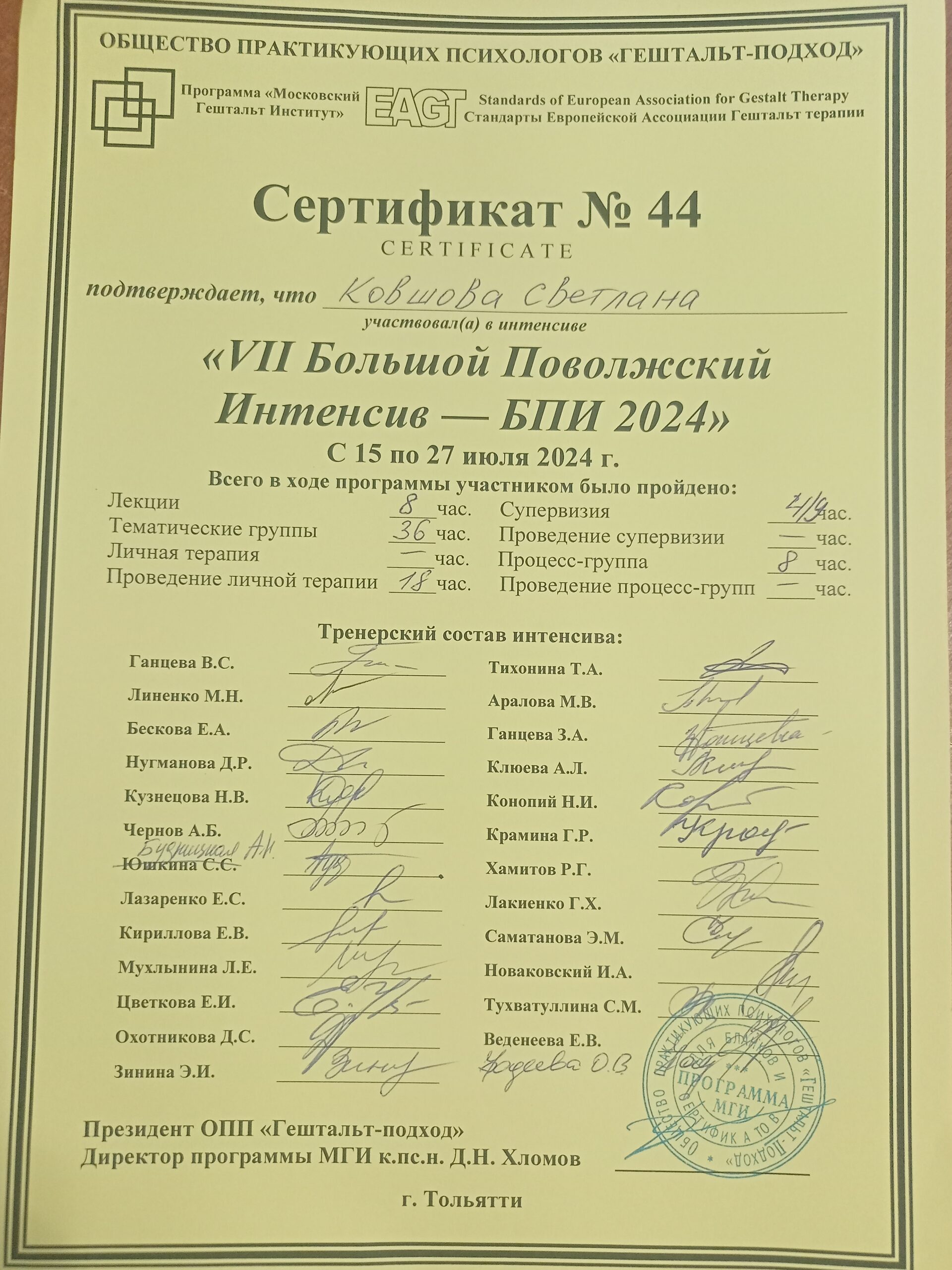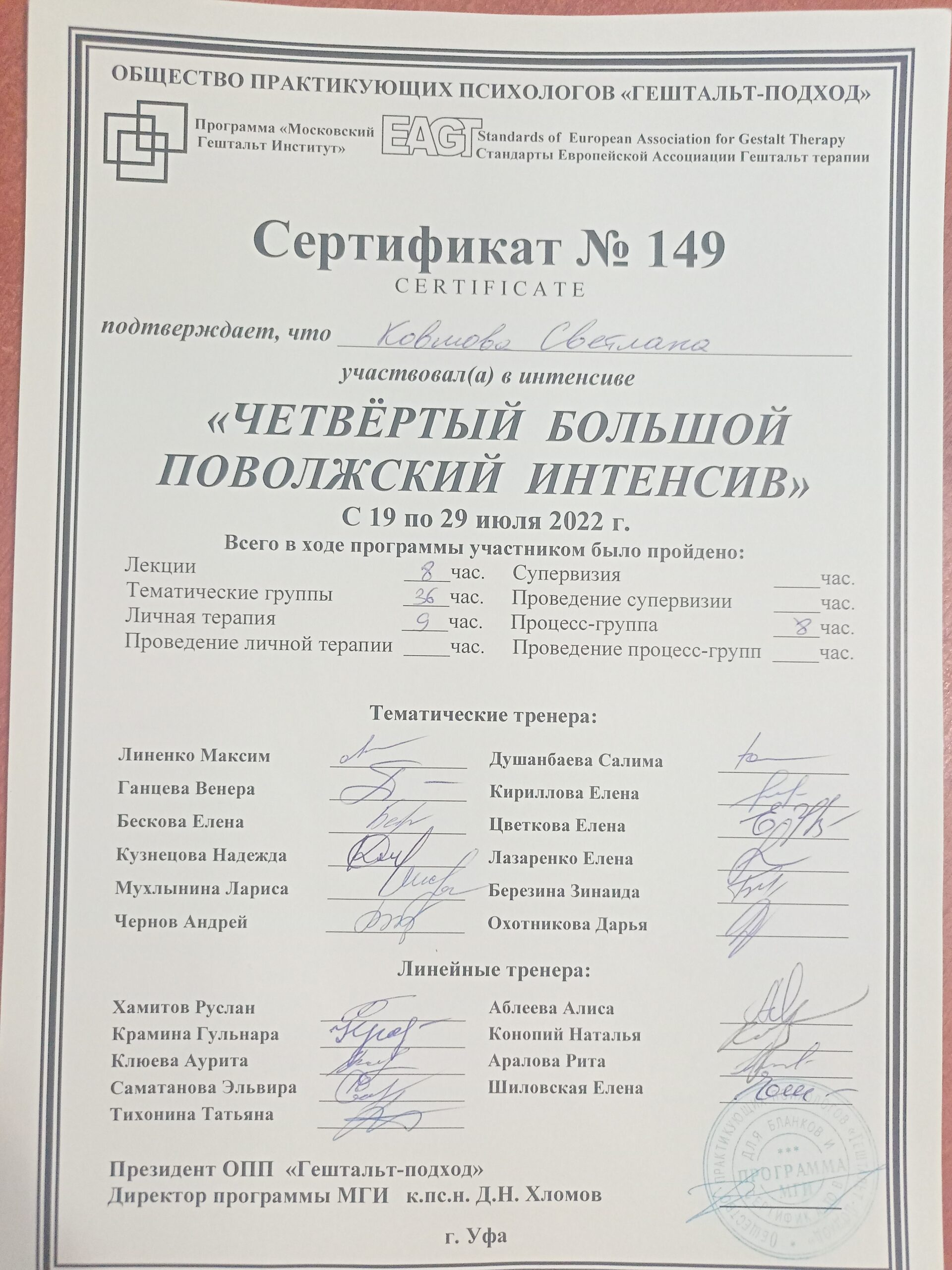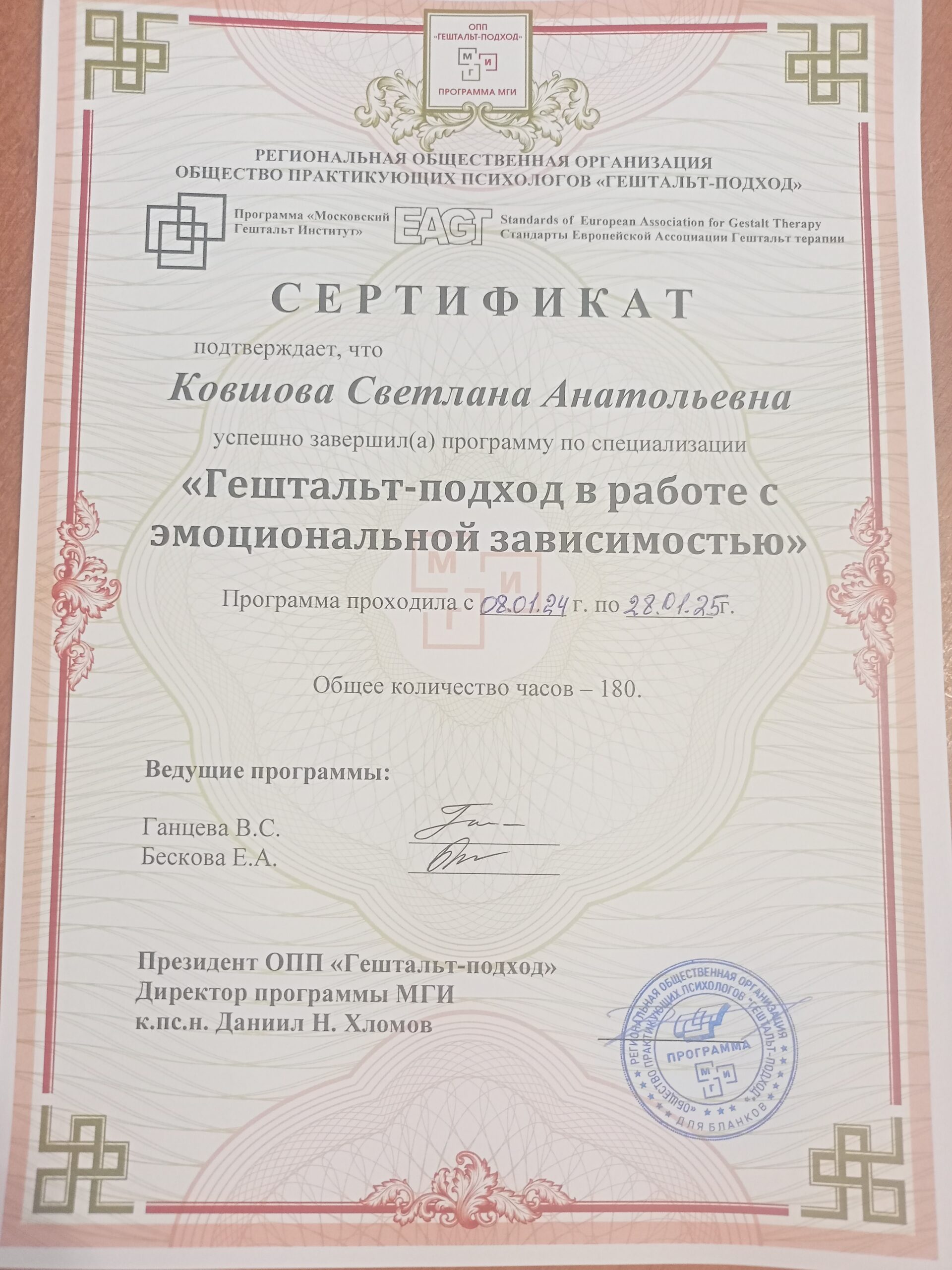 Сертификат о прохождении специализации"сексологическое консультирование в гештальт подходе"