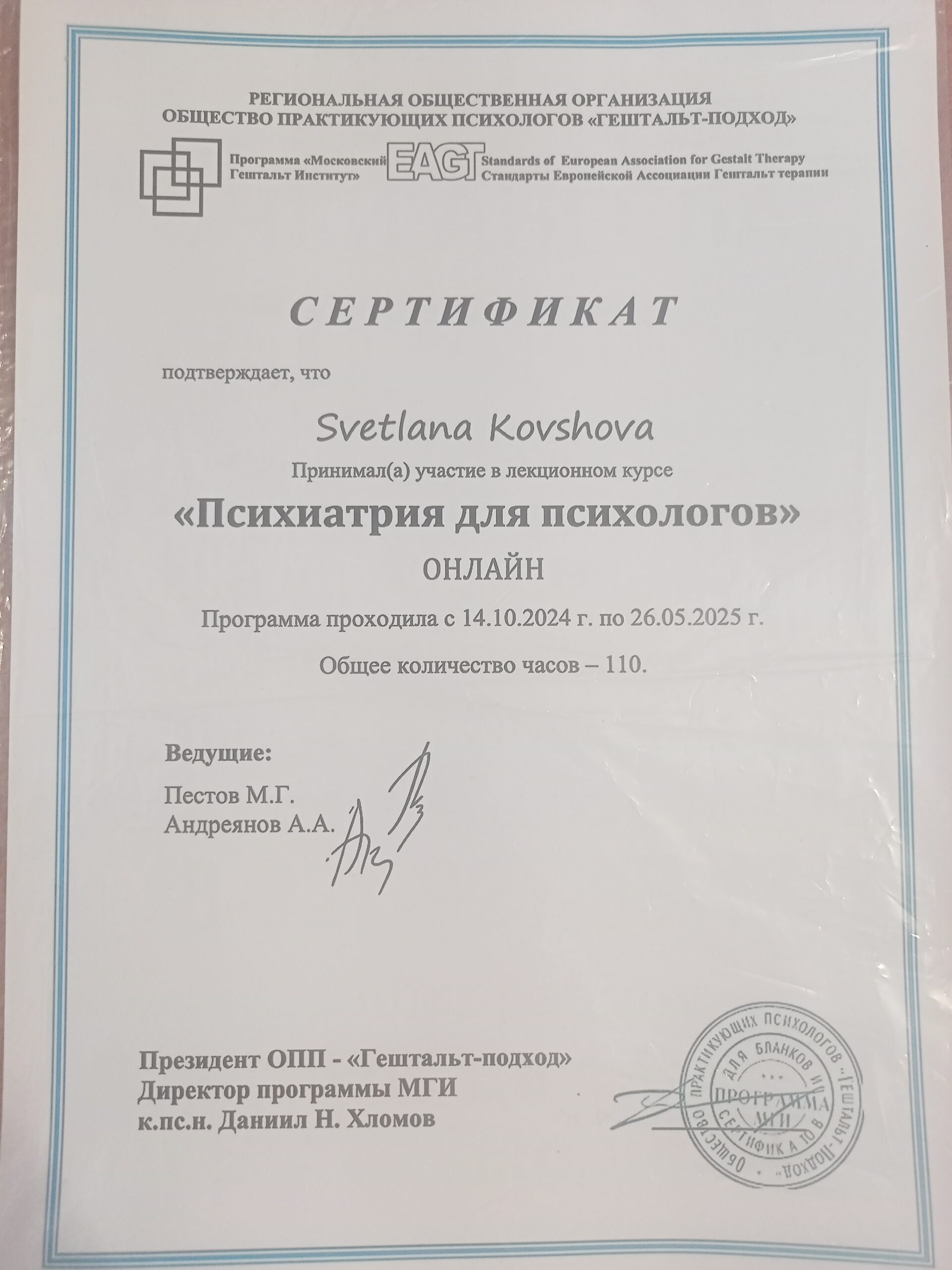 Очно прошла специализации по психосексуальному развитию и работе с зависимостями.
