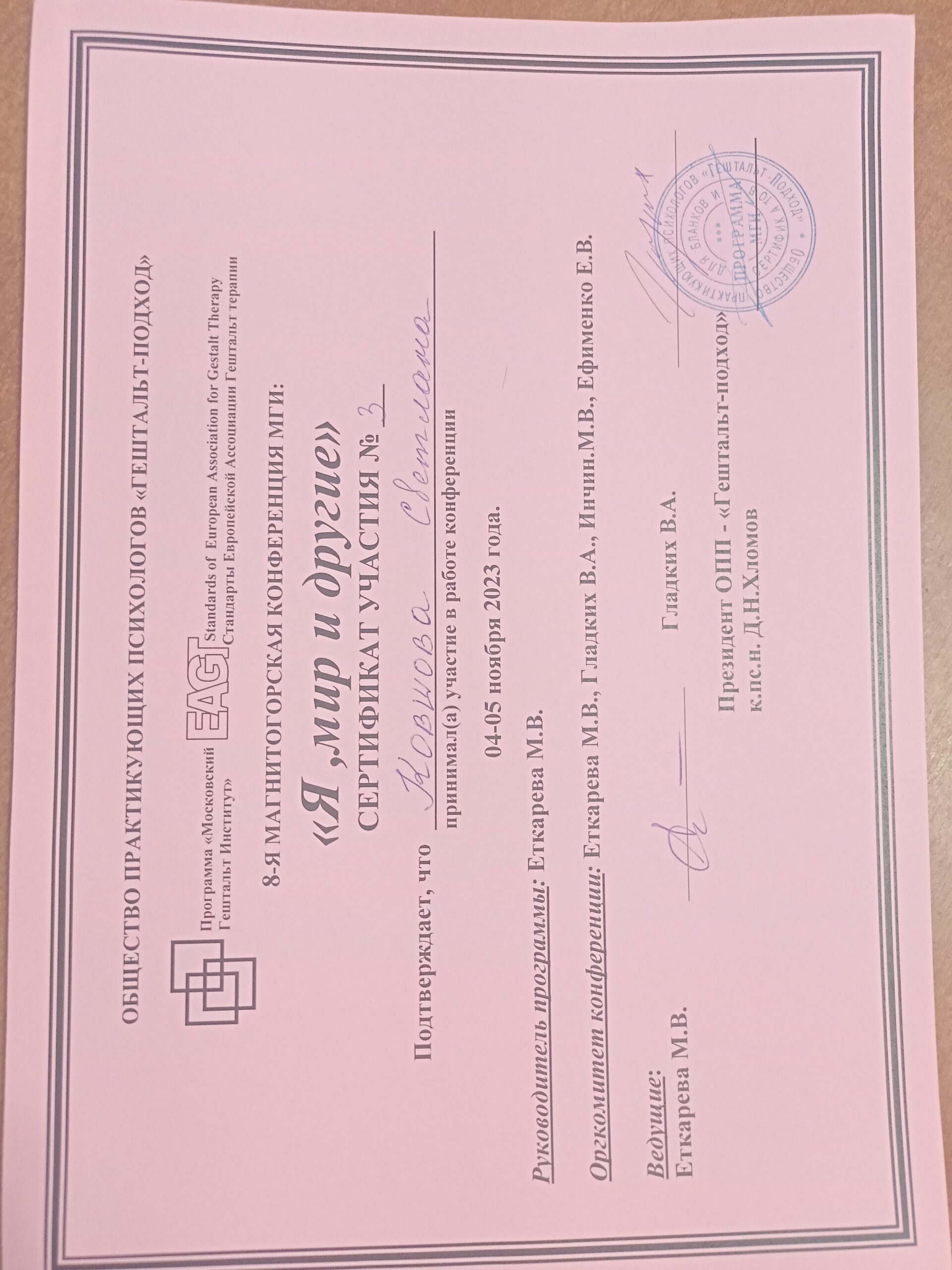 Продолжаюо обучение в МГИ, личную терапию,работаю с супервизором.