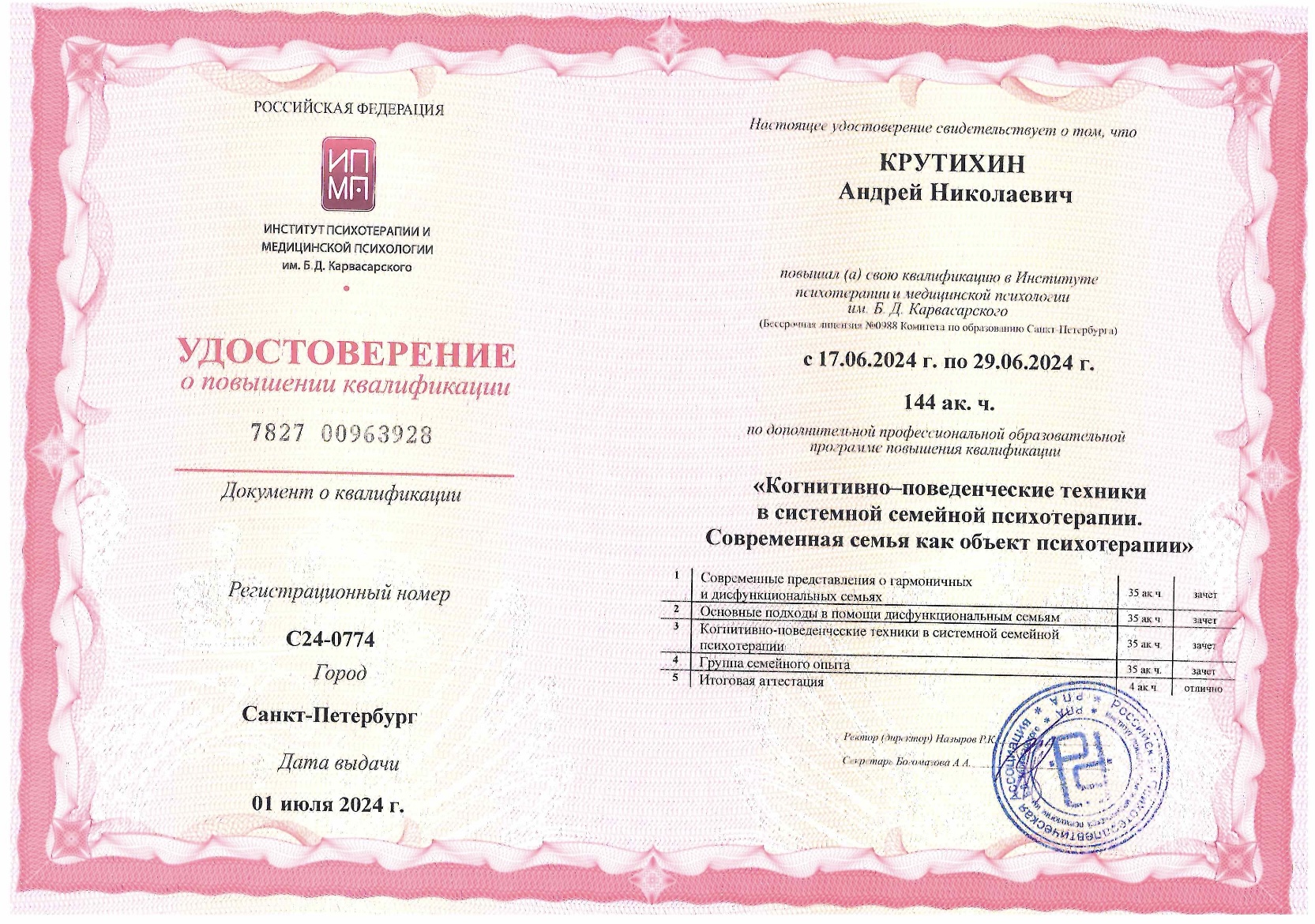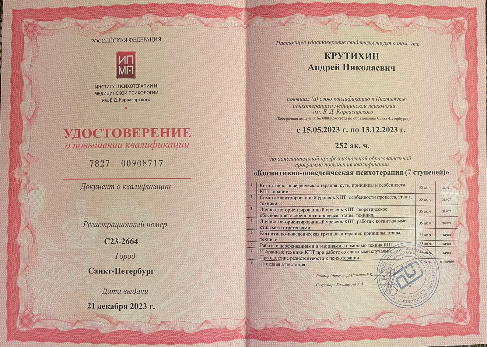 КПТ "Институт психотерапии и медицинской психологии им. Б.Д. Карвасарского" 7 ступеней КПТ - 252 ак.час. КПТ "Институт психотерапии и медицинской психологии им. Б.Д. Карвасарского" "КПТ В Семейной Системе" - 144 ак.час.