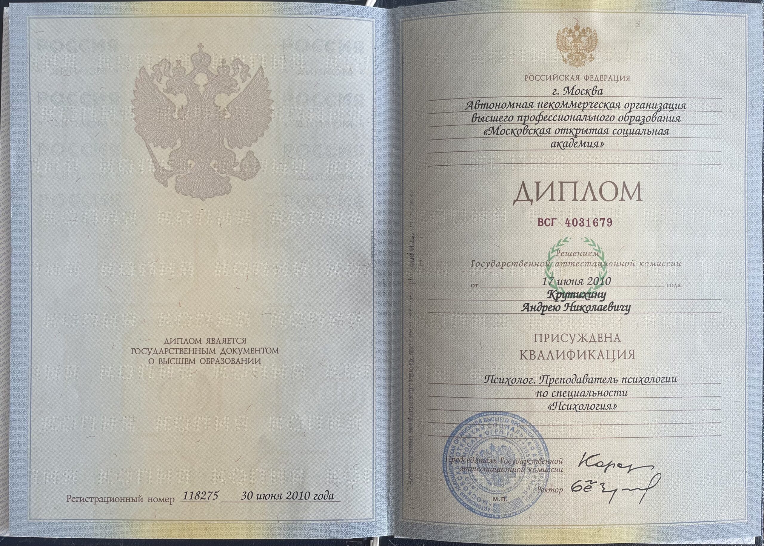 Высшее образование "Московская Открытая Социальная Академея" , окончил в 2010 году.