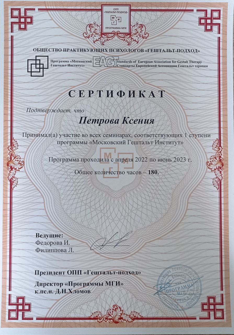 ✅ Московский Гештальт Институт - гештальт-терапия по стандартам Европейской Ассоциации гештальт-терапии (завершаю 2-ю ступень в апреле 2026 года, 4 года практико-ориентированного обучения).