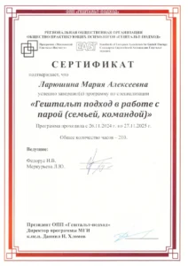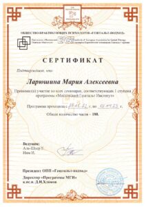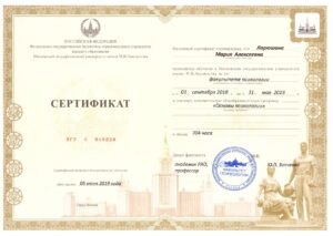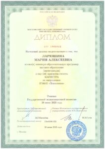 Я являюсь магистром психологии, выпускницей одного из ведущих вузов страны – МГУ имени М.В. Ломоносова, а также я постоянно развиваюсь в своей профессии: повышаю свою квалификацию в разных областях, участвую в конференциях и профессиональных мероприятиях.
