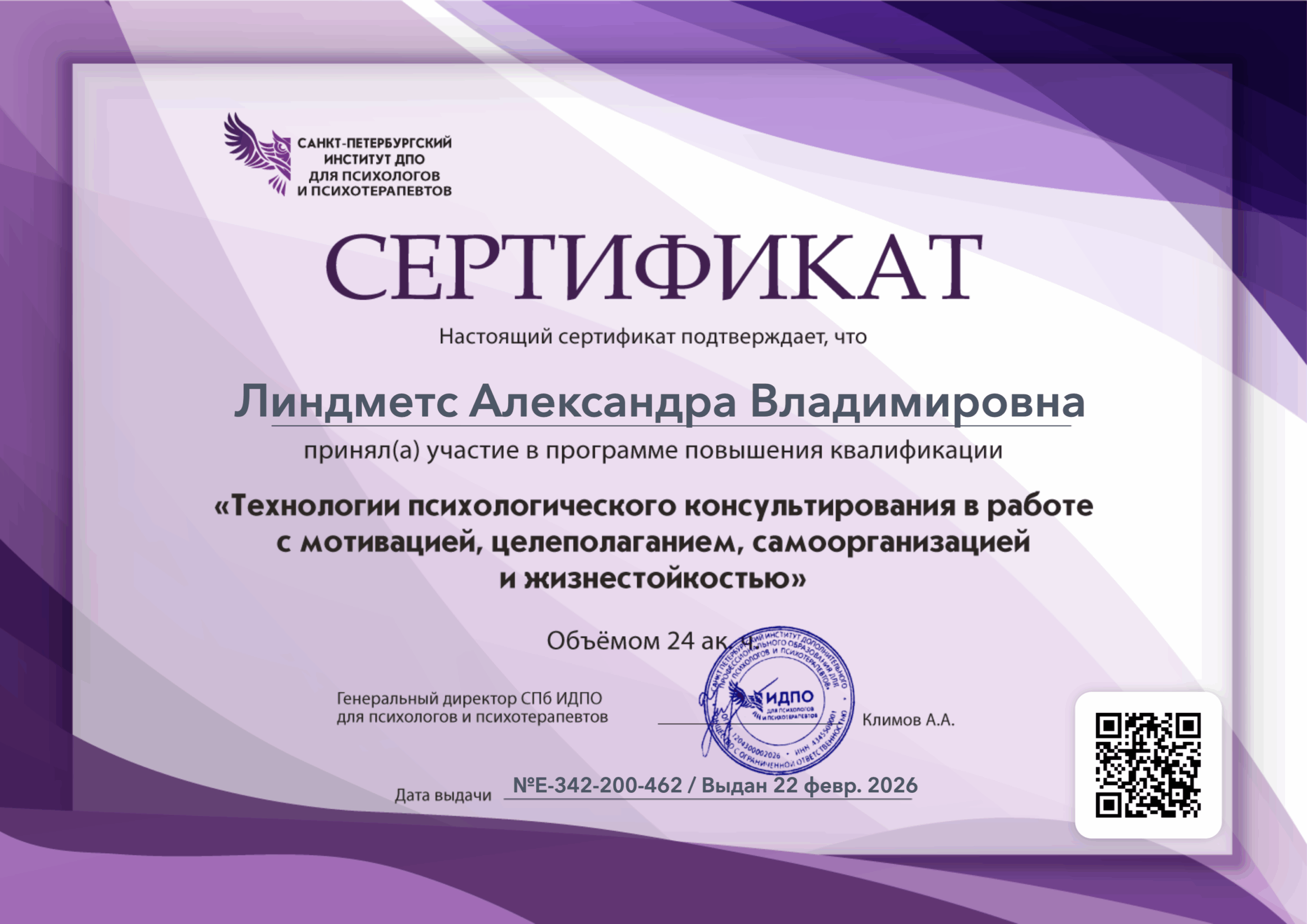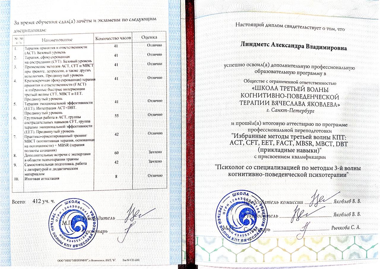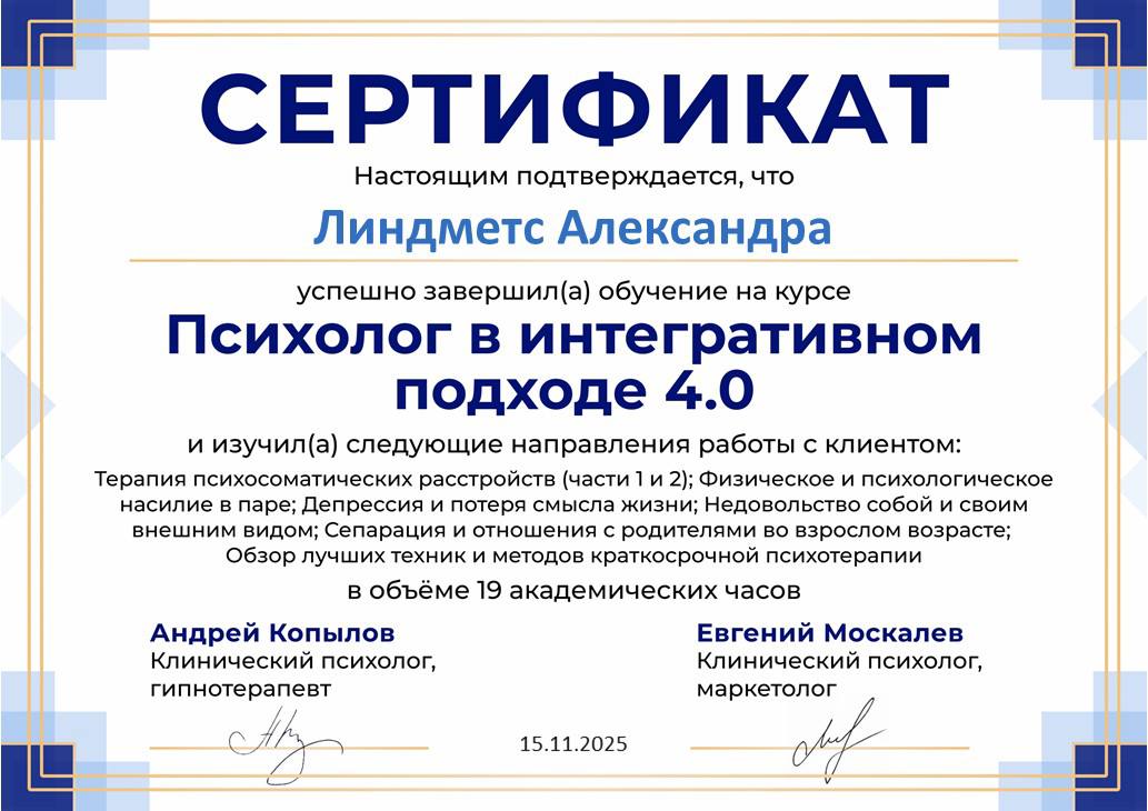 Здравствуйте! Я клинический психолог с высшим психологическим образованием (специалитет), специалист в области индивидуального консультирования. Моя цель — помочь вам не просто "пережить" трудный период, а выстроить устойчивую внутреннюю опору и овладеть инструментами для самостоятельной работы со своим состоянием.