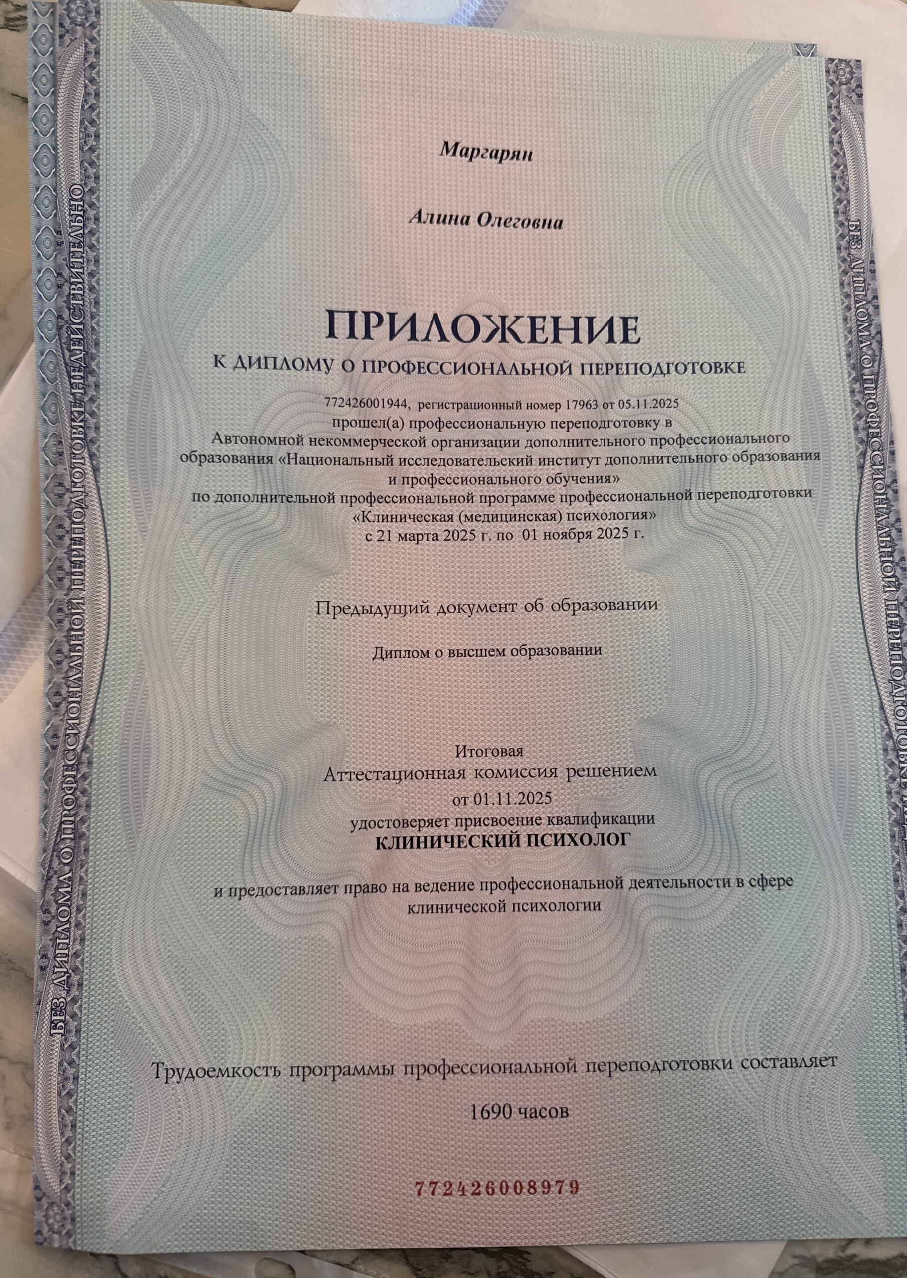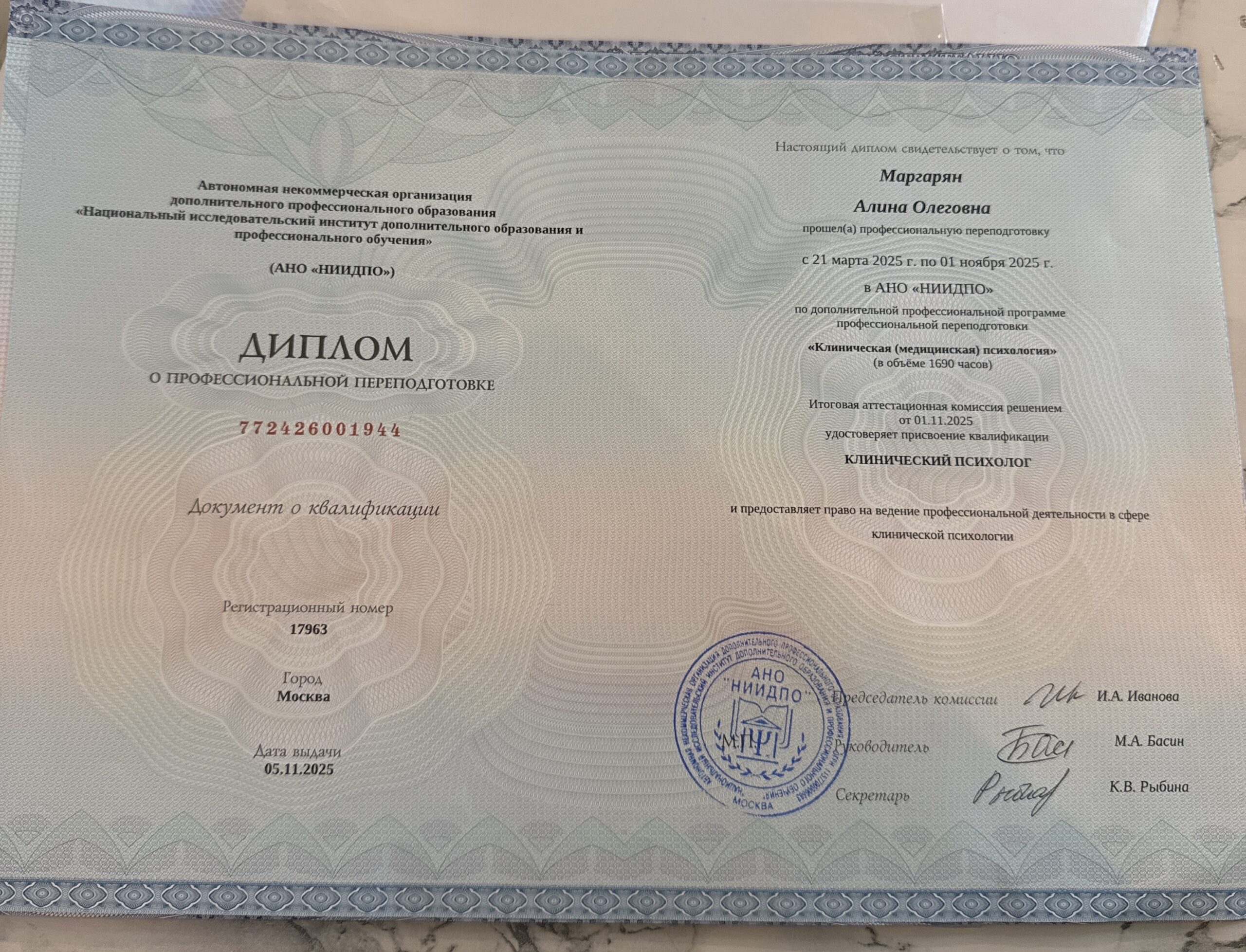 Меня зовут Маргарян Алина Олеговна, я дипломированный клинический медицинский психолог.