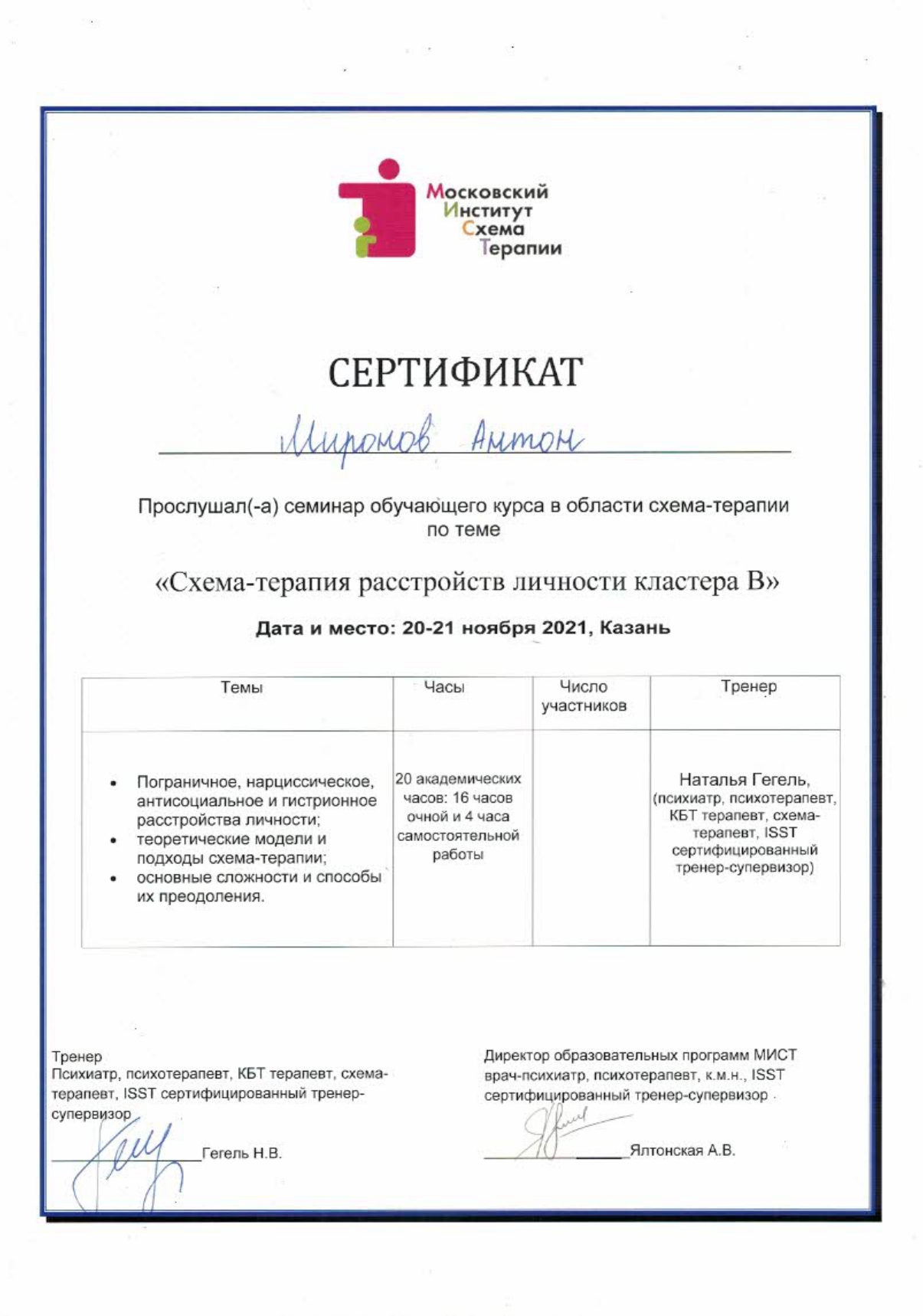 Меня зовут Миронов Антон Владимирович. Я медицинский психолог, сертифицированный логотерапевт, НЛП-практик, схематерапевт, коуч, эксперт в области лечения и реабилитации наркологических и поведенческих расстройств. (Наркомания-алкоголизм-игромания)