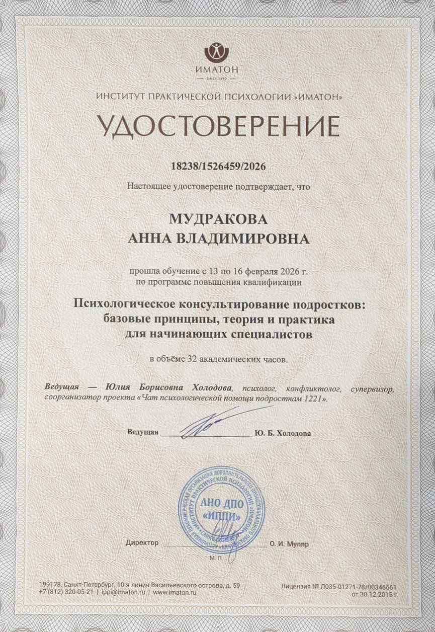 К психологу обращалась впервые. Сначала даже не знала, как правильно сформулировать свой вопрос, даже смущалась. В ходе беседы смущение ушло. Разговор с Анной Владимировной получился очень душевным и полезным. Прояснила для себя всё, что хотела в плане ДПДГ-практики и некоторые другие моменты. Договорились о продолжении онлайн-встреч.