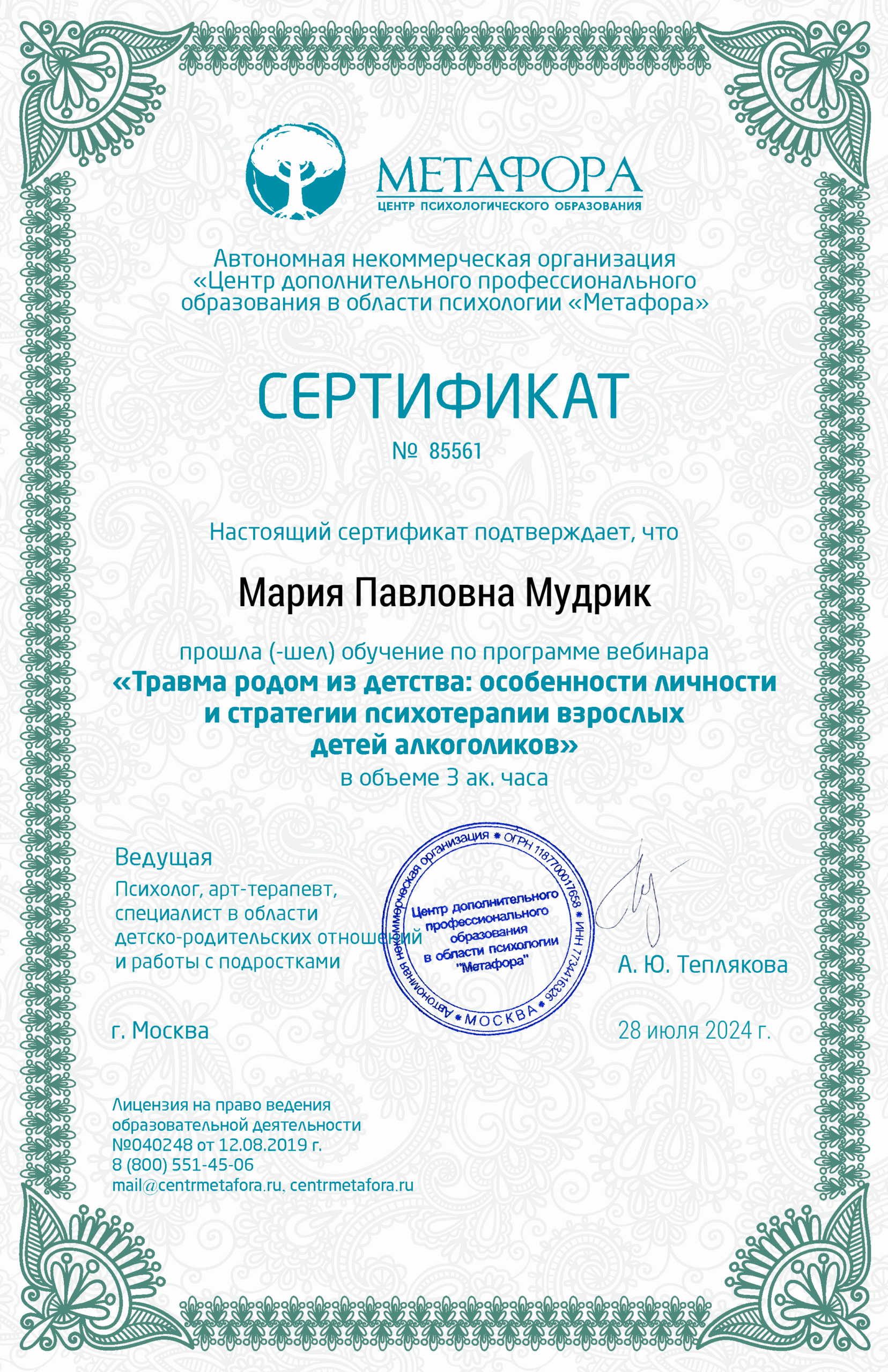 Я психолог, который помогает разбирать не только проблемы, но и смыслы. Работаю в психодинамическом и интегративном подходах: соединяю разные техники, чтобы найти именно ваш путь к изменениям.