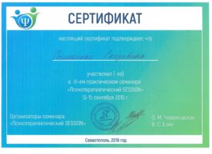 Я имею высшее психологическое специальное образование, повышение квалификации по консультированию и коучингу, сертификат о прохождении первой ступени Московского гештальт института, продолжаю изучение души на второй ступени МГИ, участвую в разного рода конференциях и семинарах.