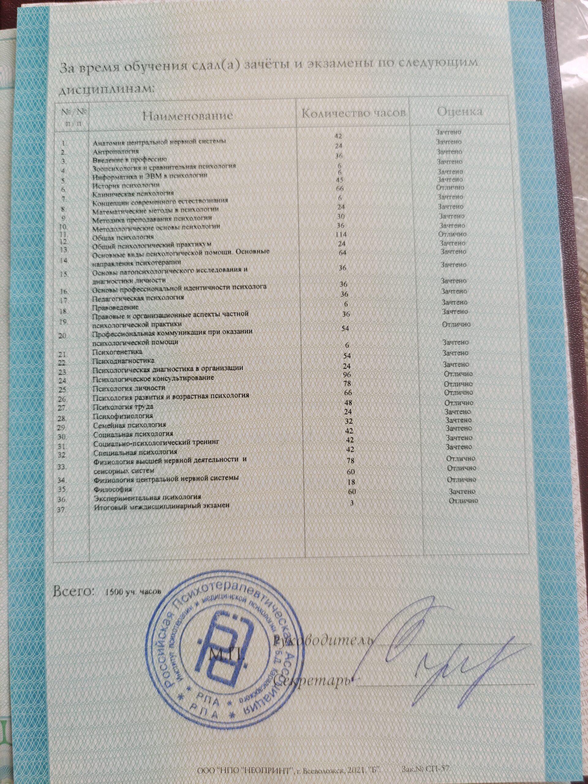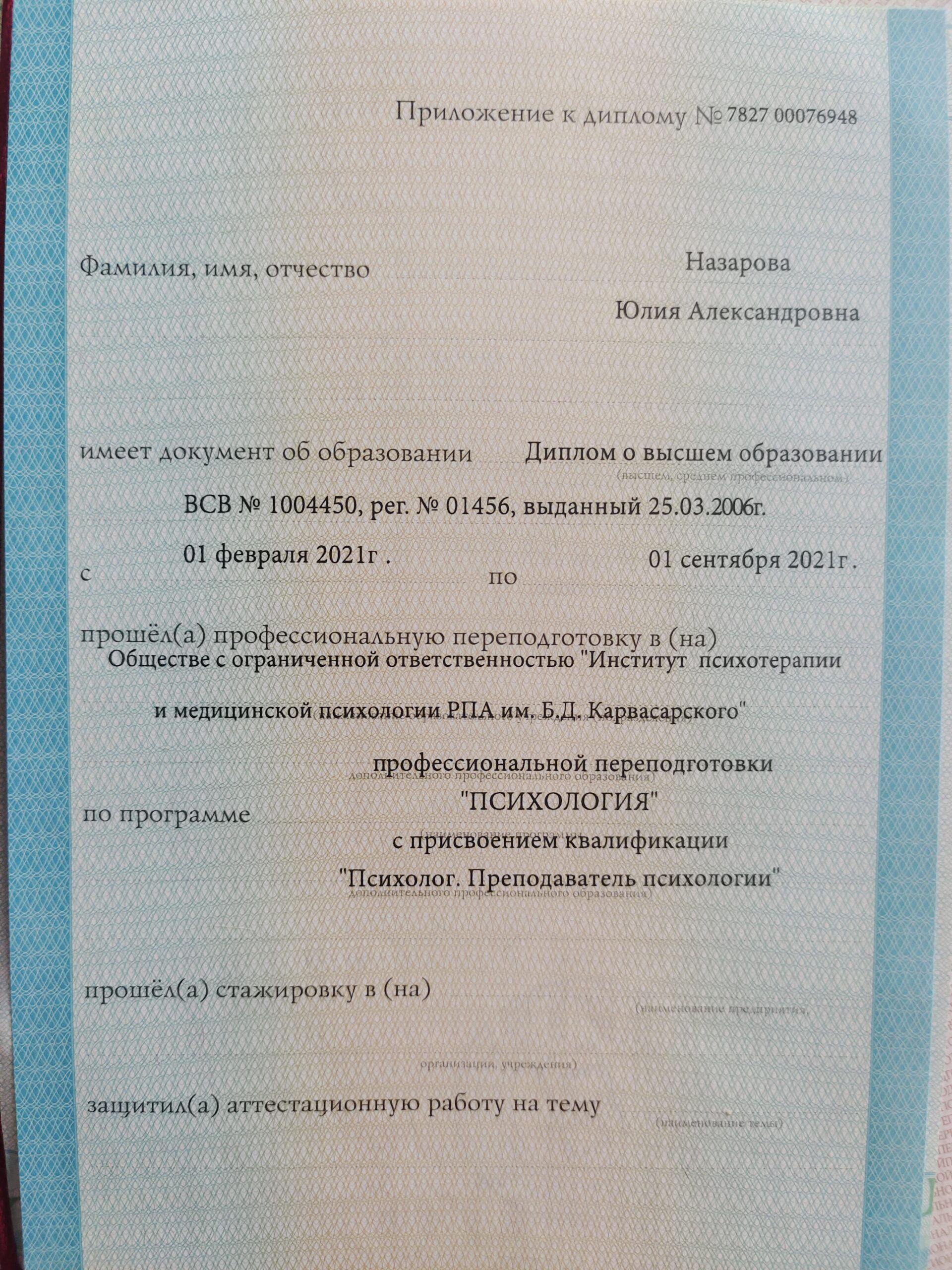 - Институт психотерапии и медицинской психологии РПА им. Б.Д. Карвасарского Психолог. Преподаватель психологии (1500 ч.)