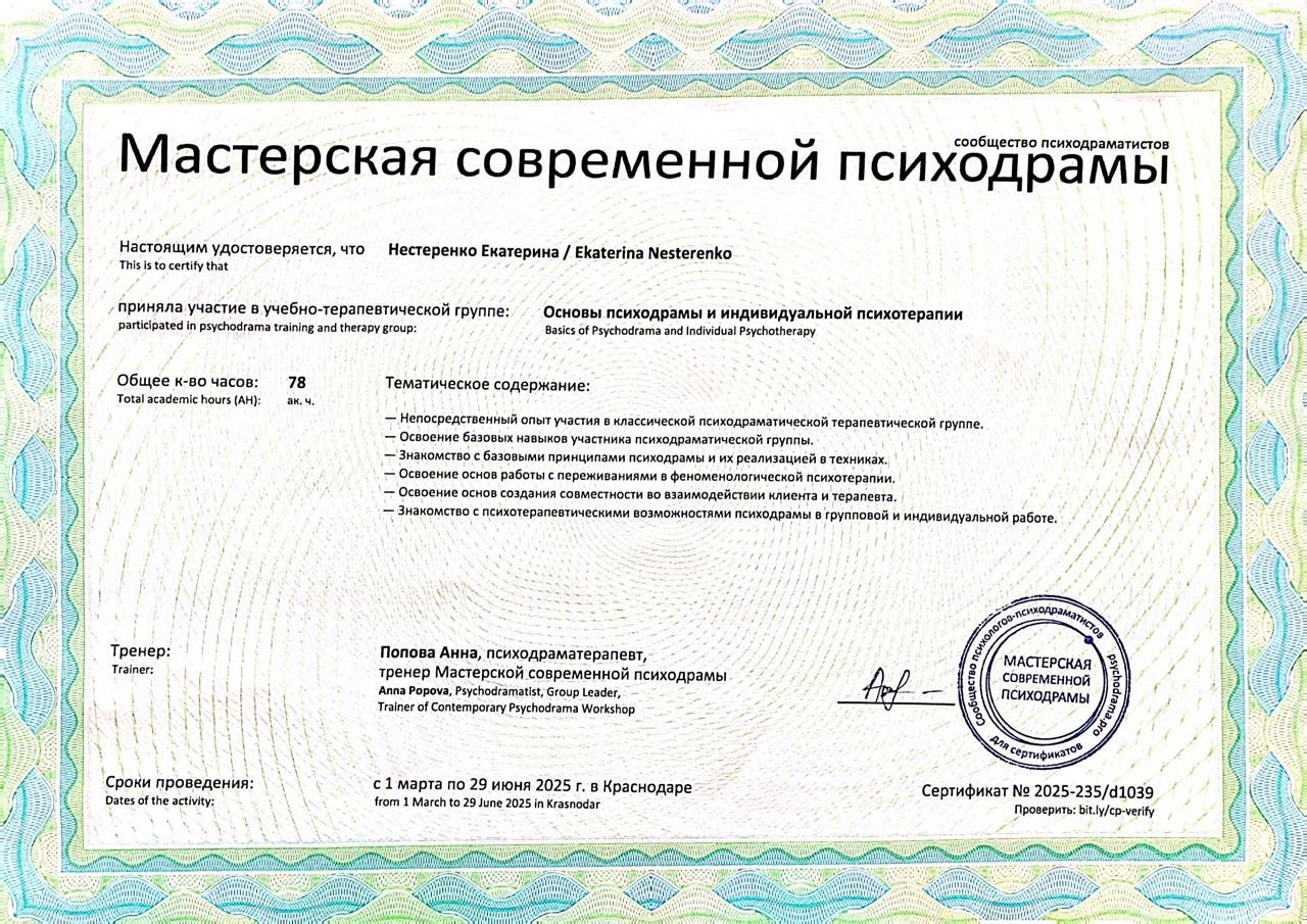 Я - Екатерина, семейный/детский/подростковый психолог-психотерапевт, педагог-психолог с высшим профильным образованием. Специализируюсь на теме отношений. Практический опыт - 8 лет. Мой профессиональный и личный клиентский опыт показывает, что изменения в жизни возможны! Более того, мы являемся авторами своей жизни. Порой, сложности выматывают и лишают жизненных сил, отношения заходят в тупик, самостоятельно найти решение не удается. И тогда, нужна помощь кого-то другого, на кого можно опереться, кому можно довериться. Ценность доверия не переоценима! Не всегда близкие могут оказать необходимую поддержку, а советы привести к изменениям. Почему стоит обратиться к специалисту? Дело в том, что знания устройства психики, практический опыт с трудными жизненными историями ,навыки, безоценочное отношение, конфиденциальность - это прерогатива профессионала.