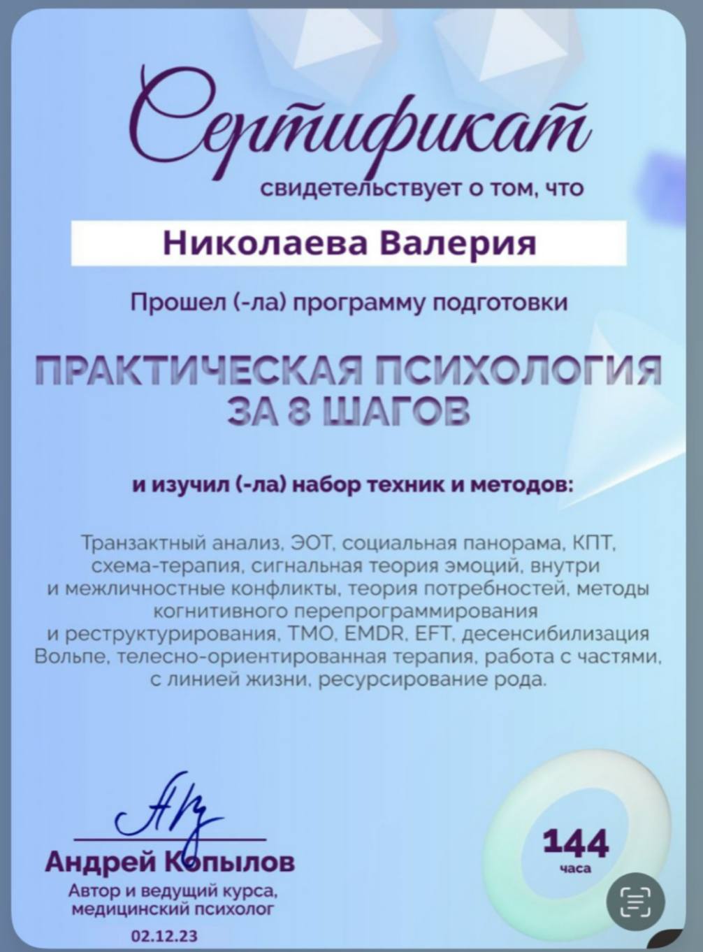 За моей практикой более 10 000 часов консультаций и 15 лет личной терапии.