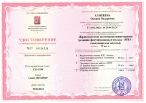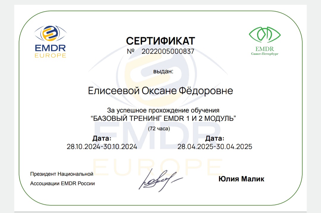 Помимо базового высшего образования, получила дополнительное обучение EMDR, ОРКТ, Мак-карты и Песочная терапия в МИП. Основными методами работы для онлайн формата являются EMDR, ОРКТ. Имею более 100 часов личной и групповой терапии, прохожу регулярно супервизию.