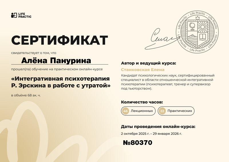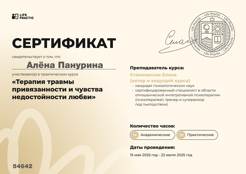Алёна профессионал своего дела, отличный психолог. Помогла разобраться в тяжёлой сложившейся ситуации и посмотреть на неё с другой стороны, прийти к определённым выводам. Сама я не смогла бы посмотреть и трезво оценить ситуацию. Спасибо большое, рекомендую