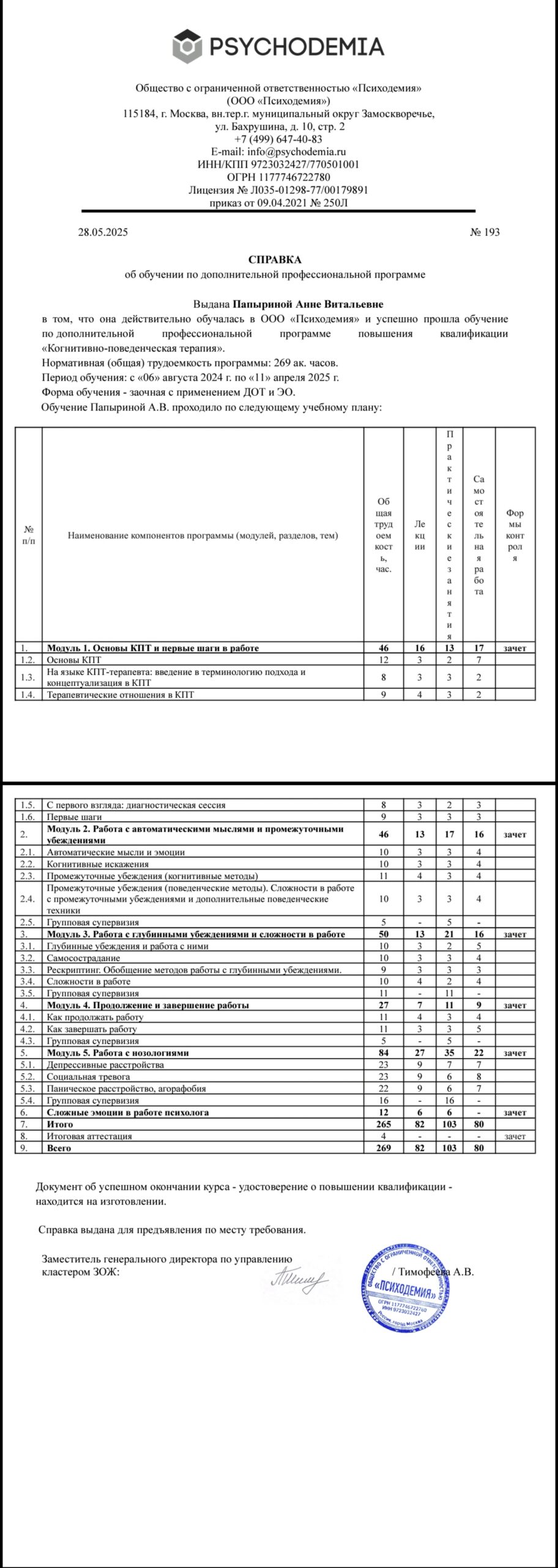 Здравствуйте! Меня зовут Анна, я обучаюсь на 5 курсе факультета психологии МГУ, получила дополнительное образование по когнитивно-поведенческой терапии и нарративной практике. Мой опыт работы - больше года.