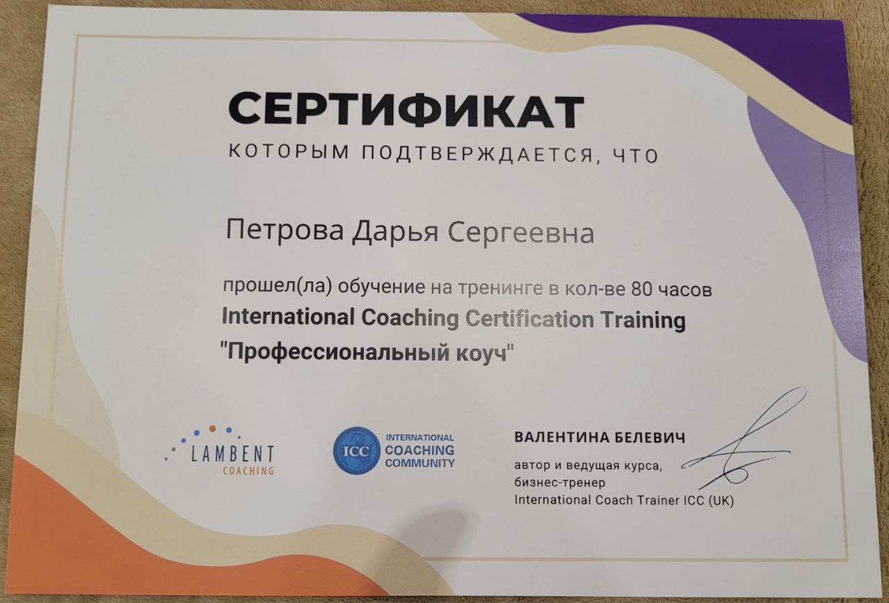 Прошла полное обучение по коучингу ICC ( 2022-2023) Опыт консультирования с 2023 года. Также прохожу личную терапию и супервизию с 2022 года.