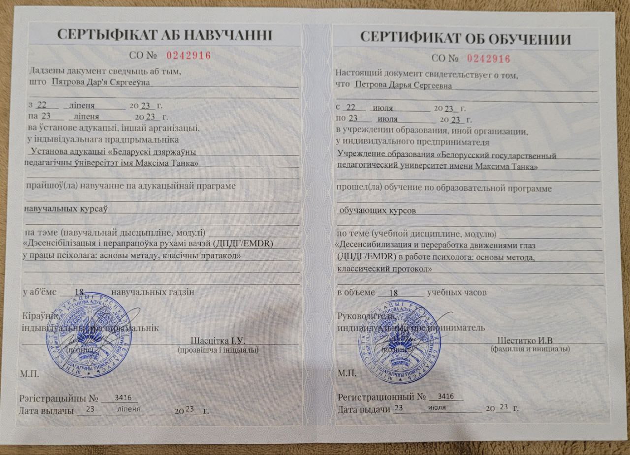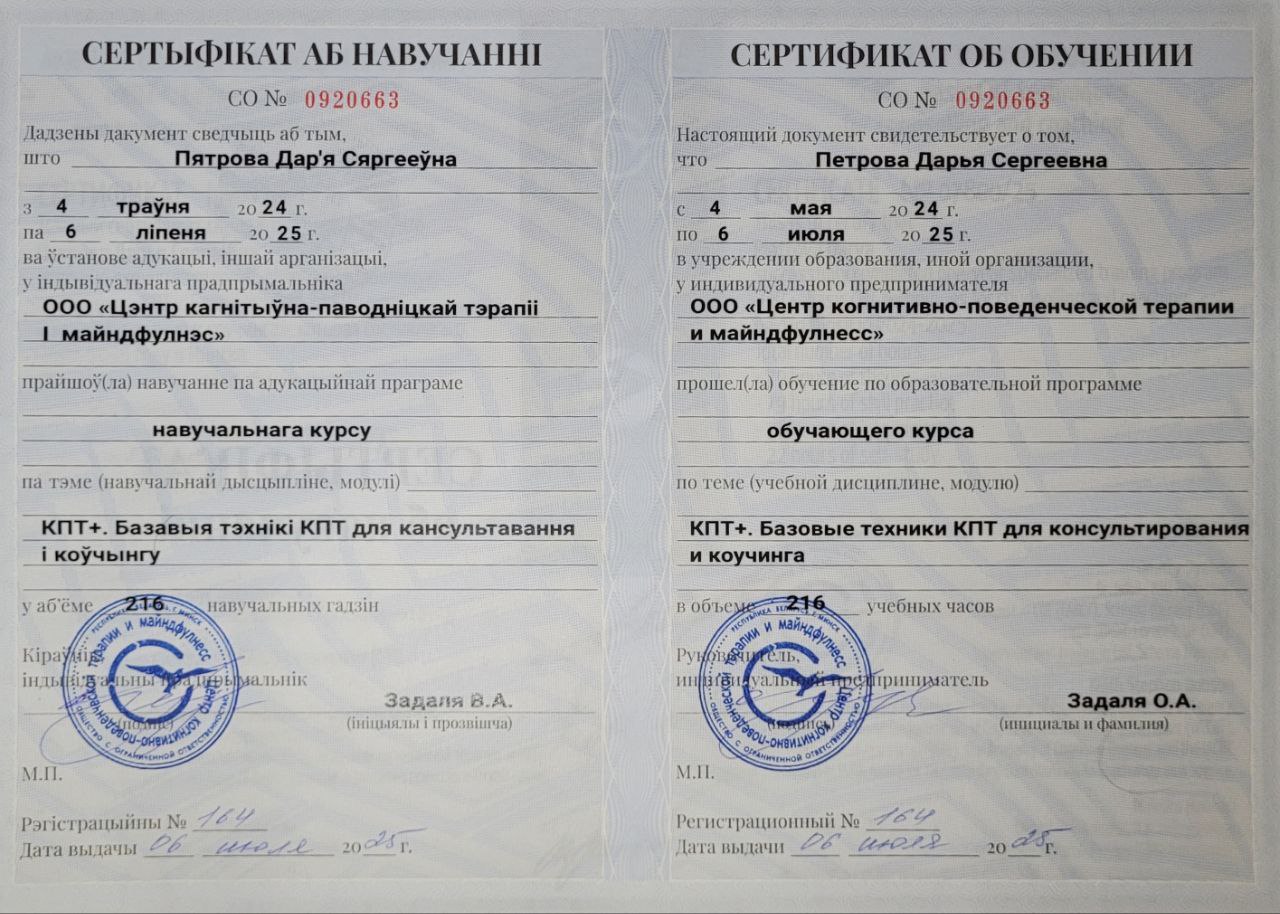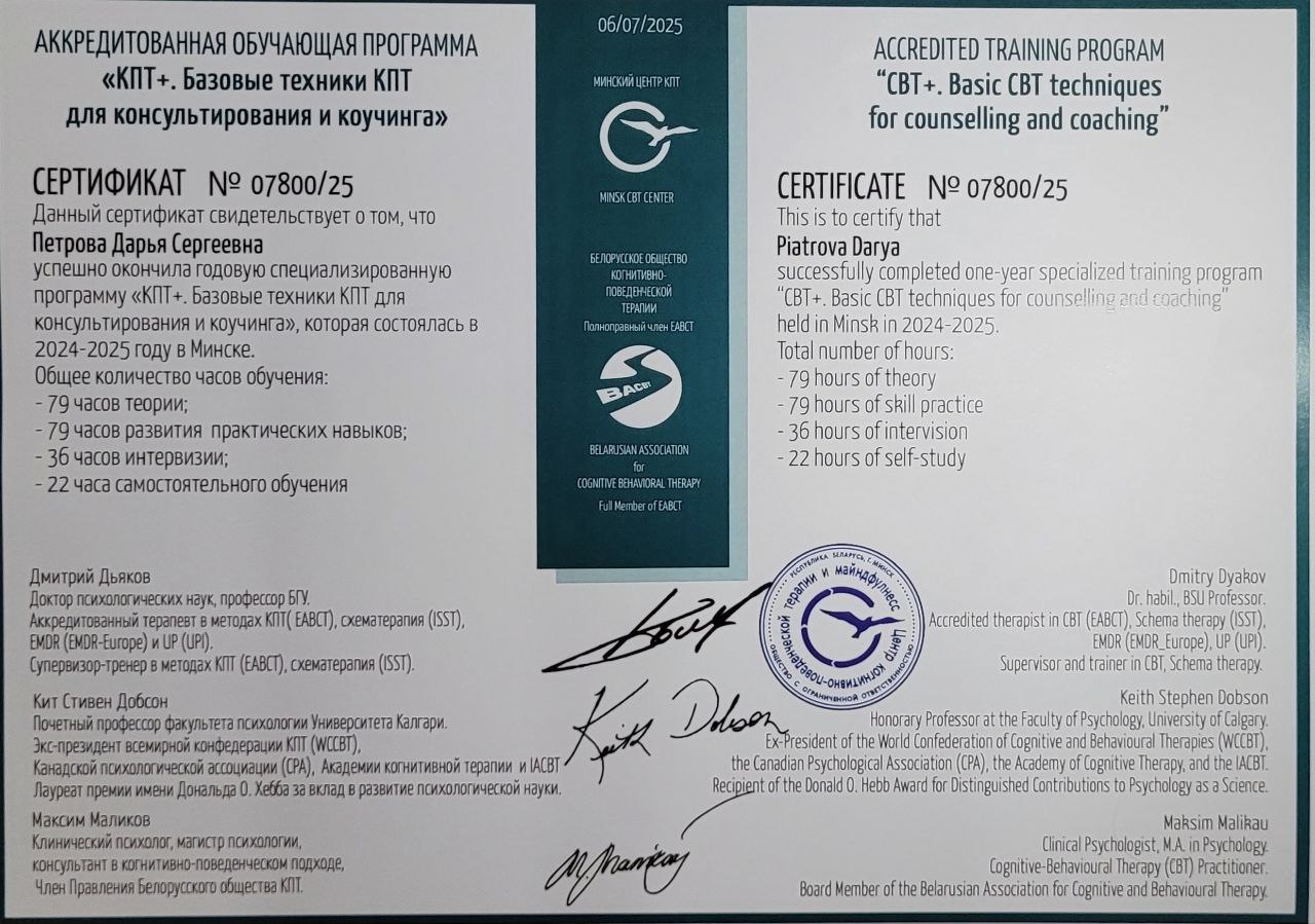 Окончила "Центр когнитивно-поведенческой терапии и майндфулнесс " (2024-2025)