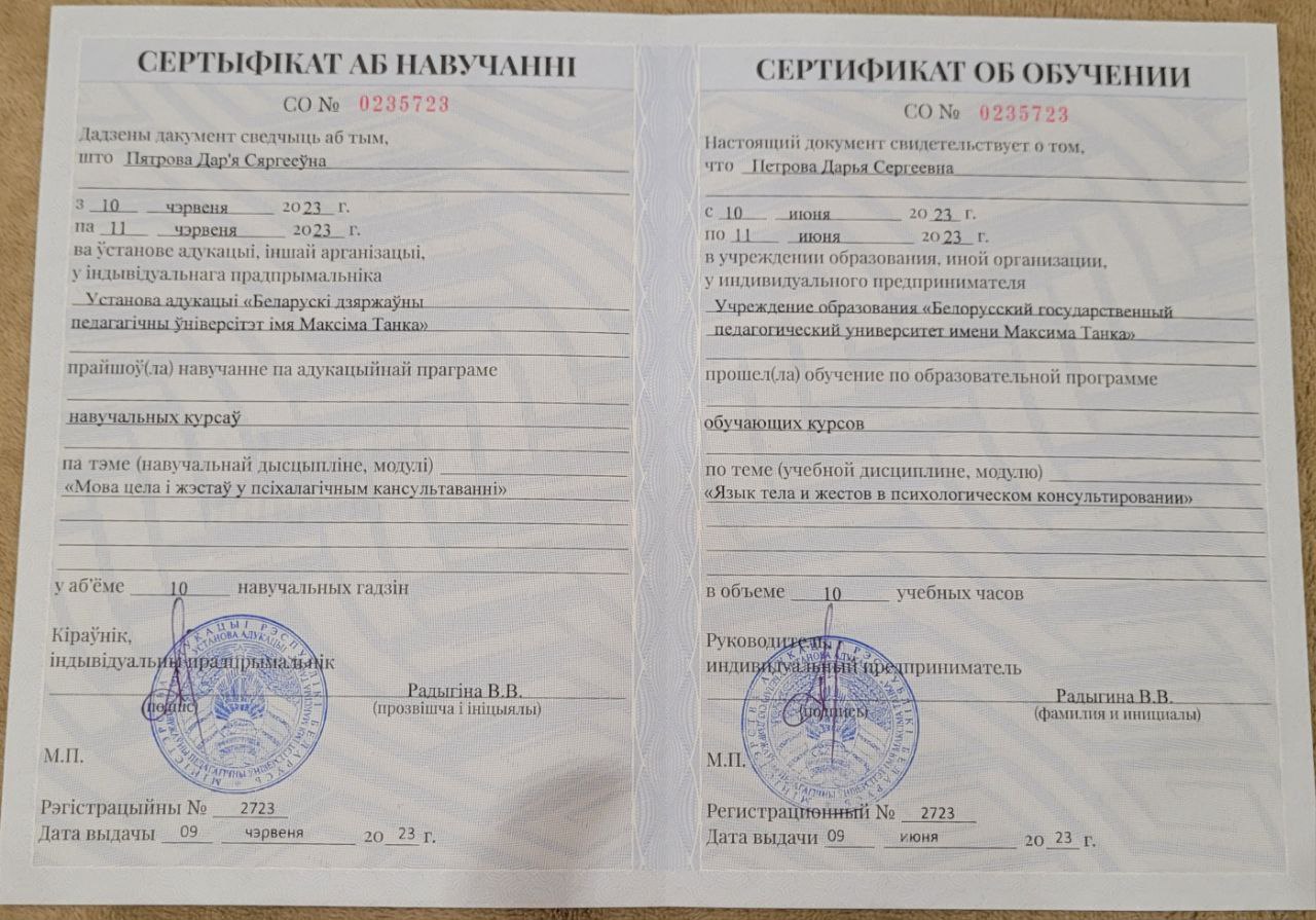 Закончила обучение в БГПУ имени Максима Танка по специальности "Психолог. Преподаватель психологии." в Минске, Республика Беларусь (2022- 2025).