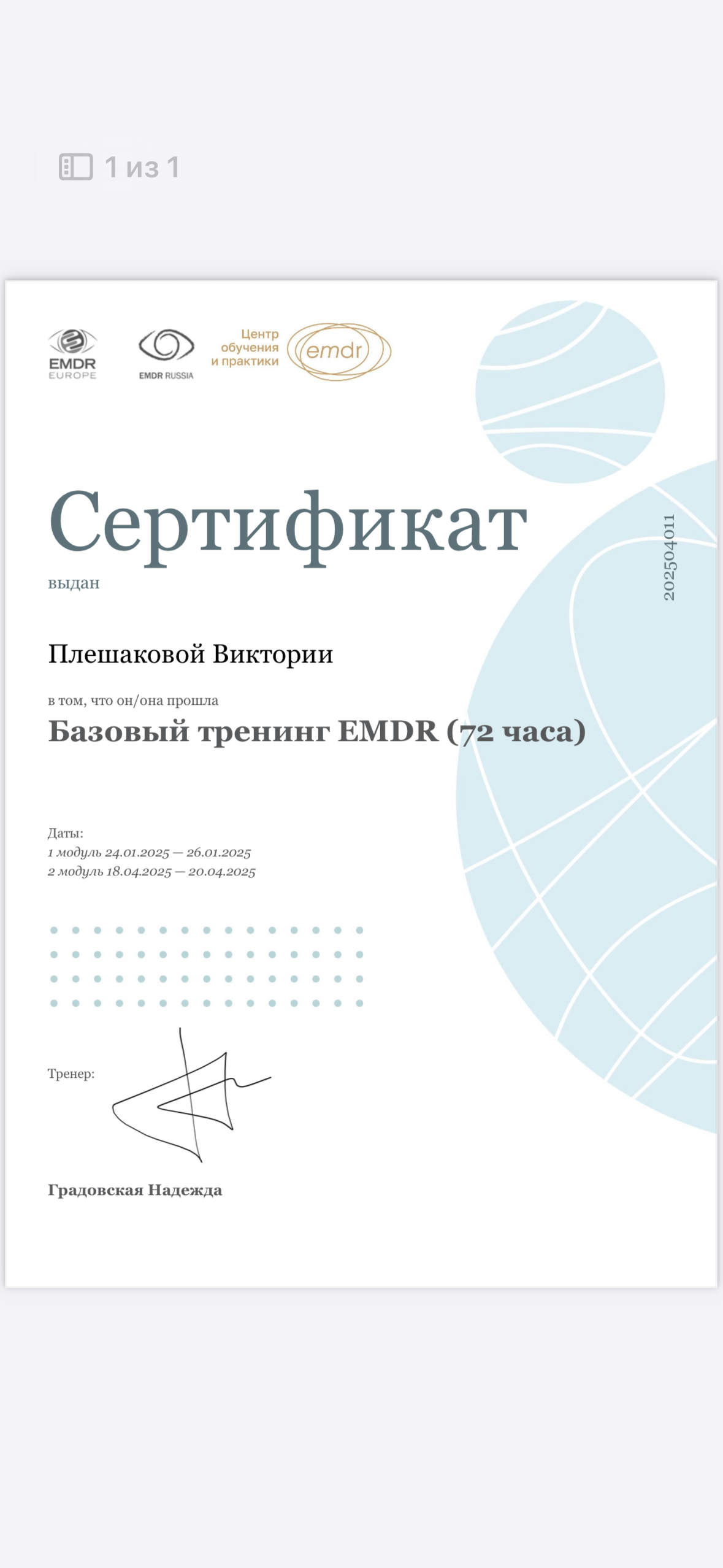 - 2025 - Московский центр обучения и практики EMDR, сертификационный курс «Базовый тренинг EMDR”