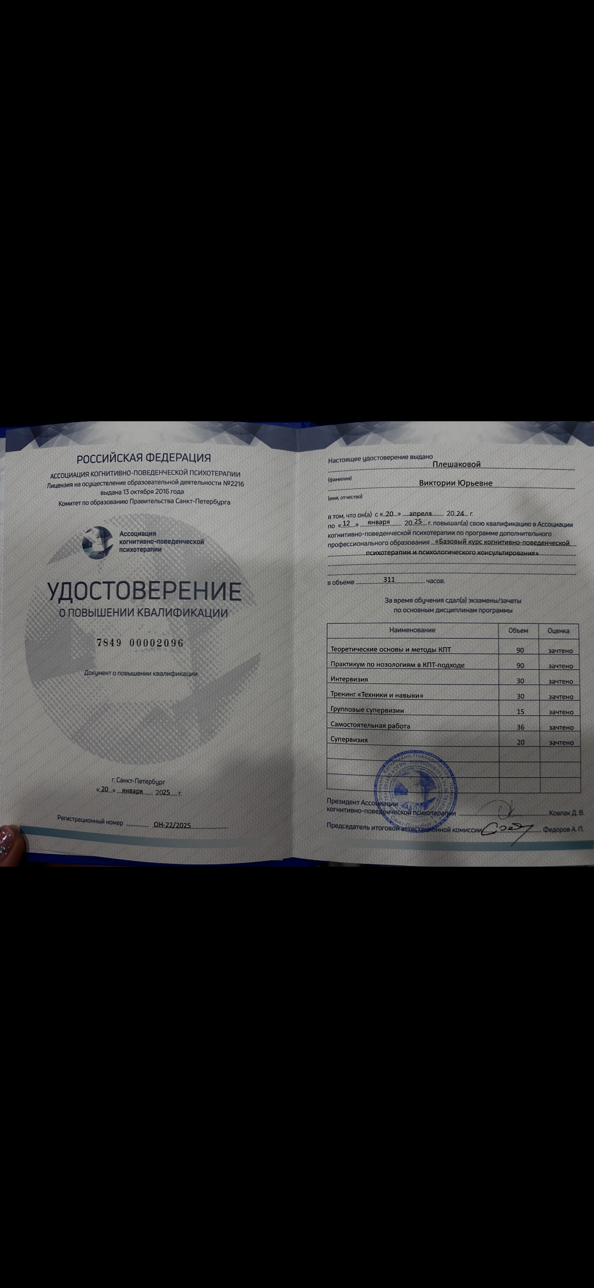 - 2024 - Ассоциация когнитивно-поведенческой психотерапии (CBT) , повышение квалификации по программе дополнительного профессионального образования «Базовый курс КПТ(CBT) и психологического консультирования»