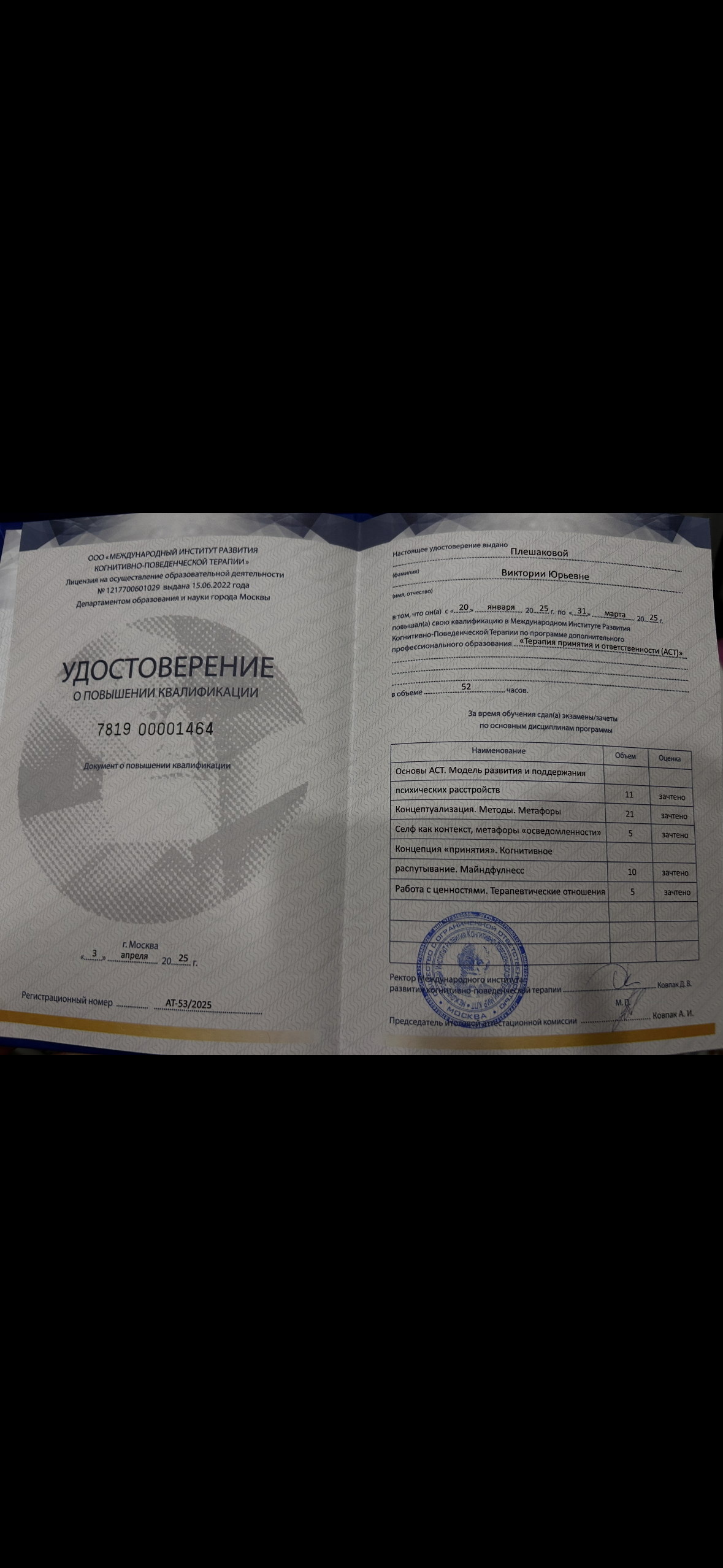 - 2025 — Международный Институт Развития КПТ, повышение квалификации по программе дополнительного профессионального образования «Терапия принятия и ответственности (ACT)»