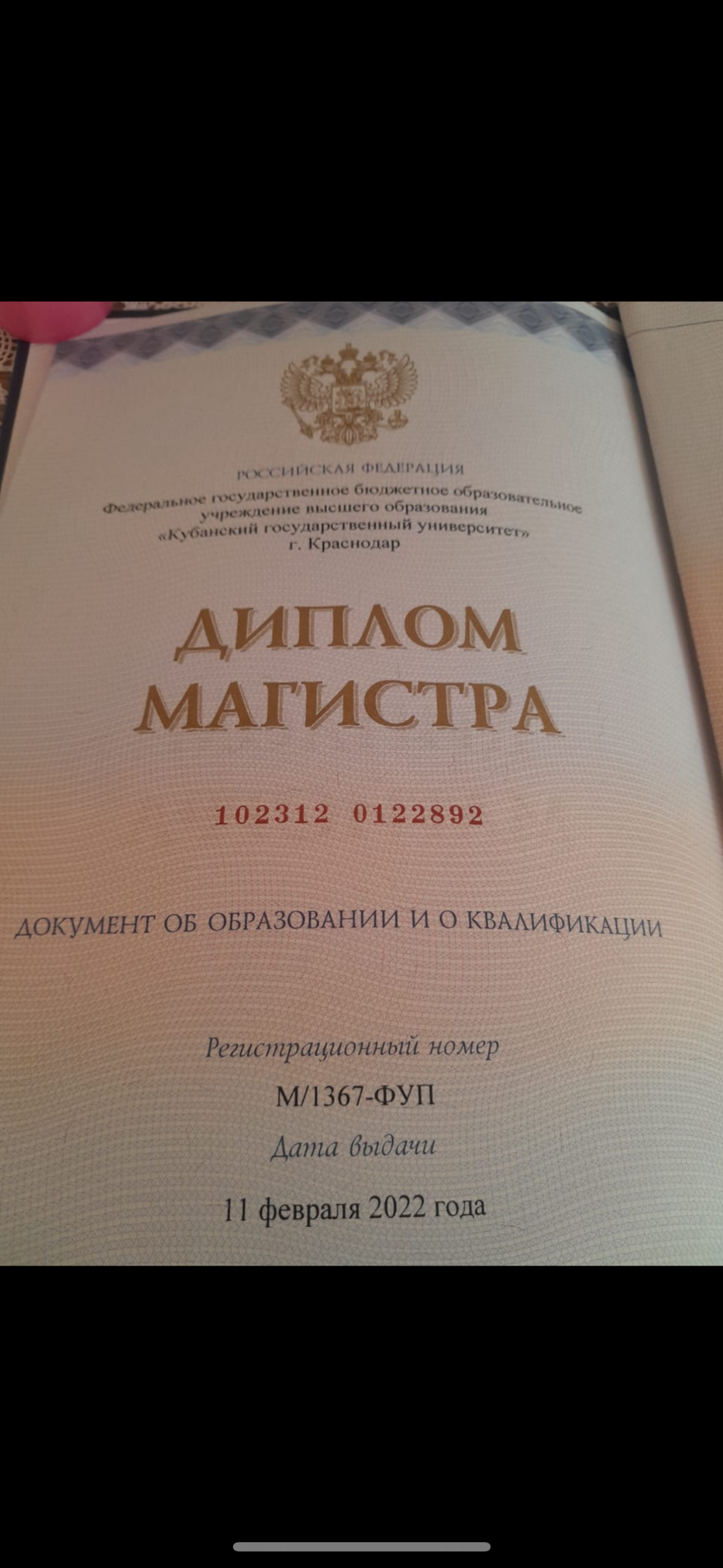 - 2019-2022 - Кубанский Государственный Университет, Магистратура , Факультет Управления и Психологии , специальность «Психология»