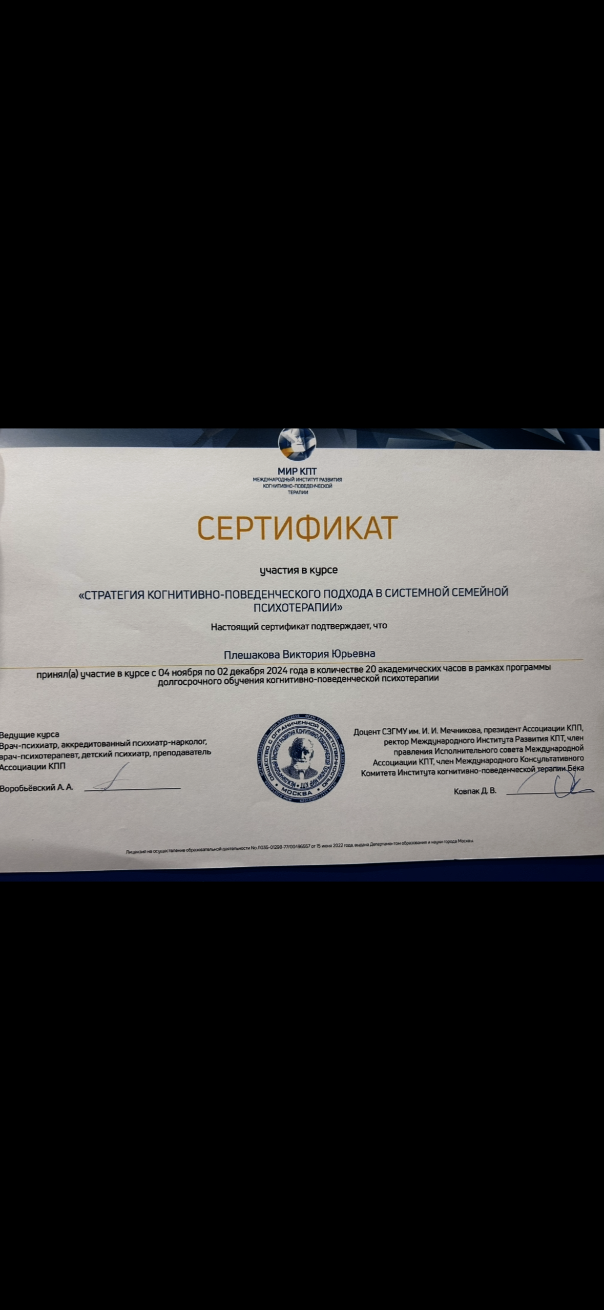 - 2024 - Международный Институт Развития КПТ , сертификационный курс «Стратегия КПТ (CBT) в системной семейной терапии».