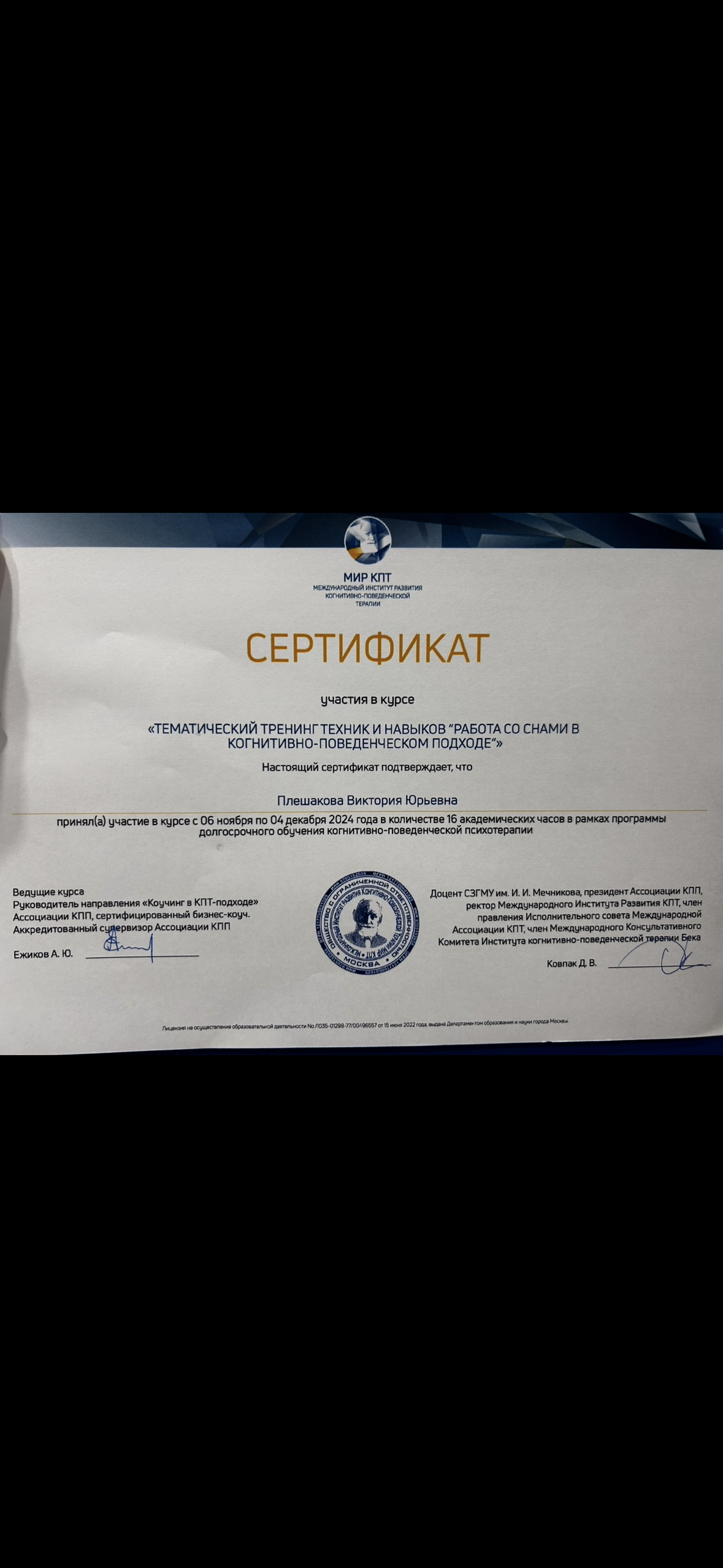 - 2024 - Международный Институт Развития КПТ , сертификационный курс «Тематический тренинг техник и навыков «Работа со снами в когнитивно-поведенческом подходе»