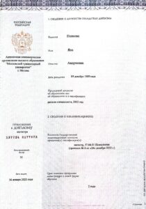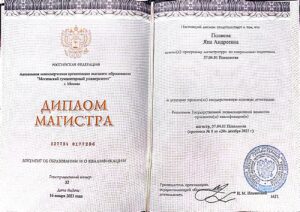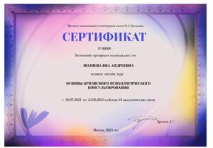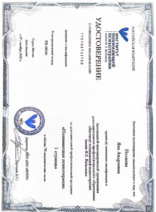 Образование: Московский Гуманитарный Университет, направление “Консультативная и клиническая психология”
