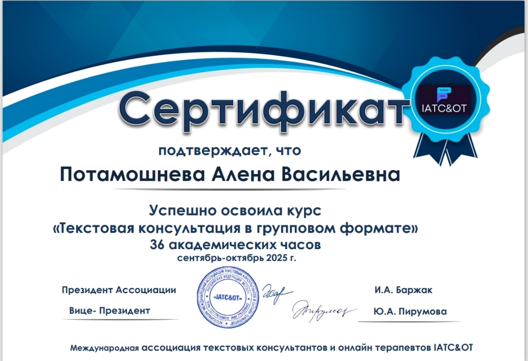Работаю в основном в формате текстового консультирования (сопровождения), но так же провожу классические онлайн консультации.