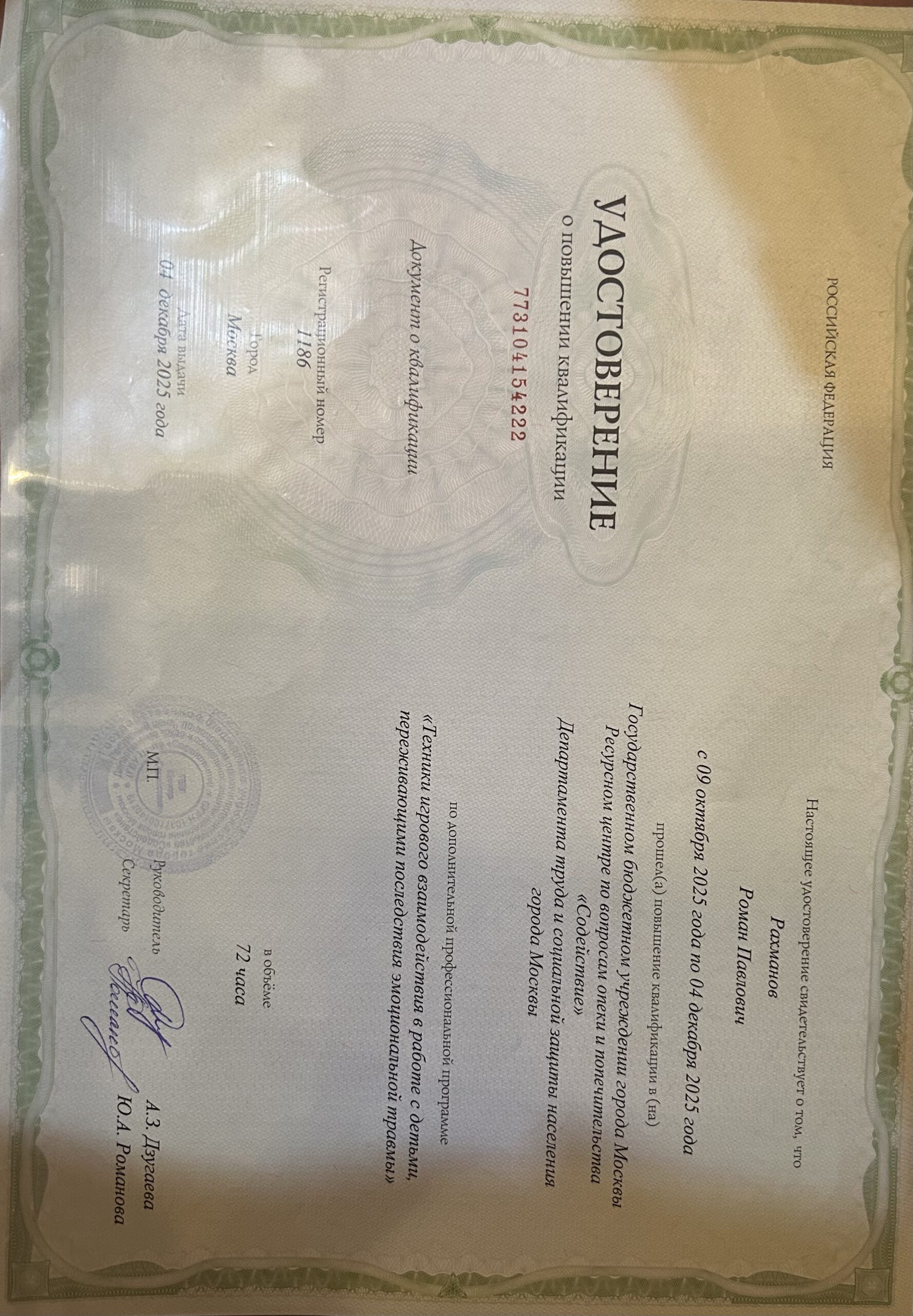 - Профессиональная переподготовка в «Институт прикладной психологии в социальной сфере» по направлению "Клиническая психология»