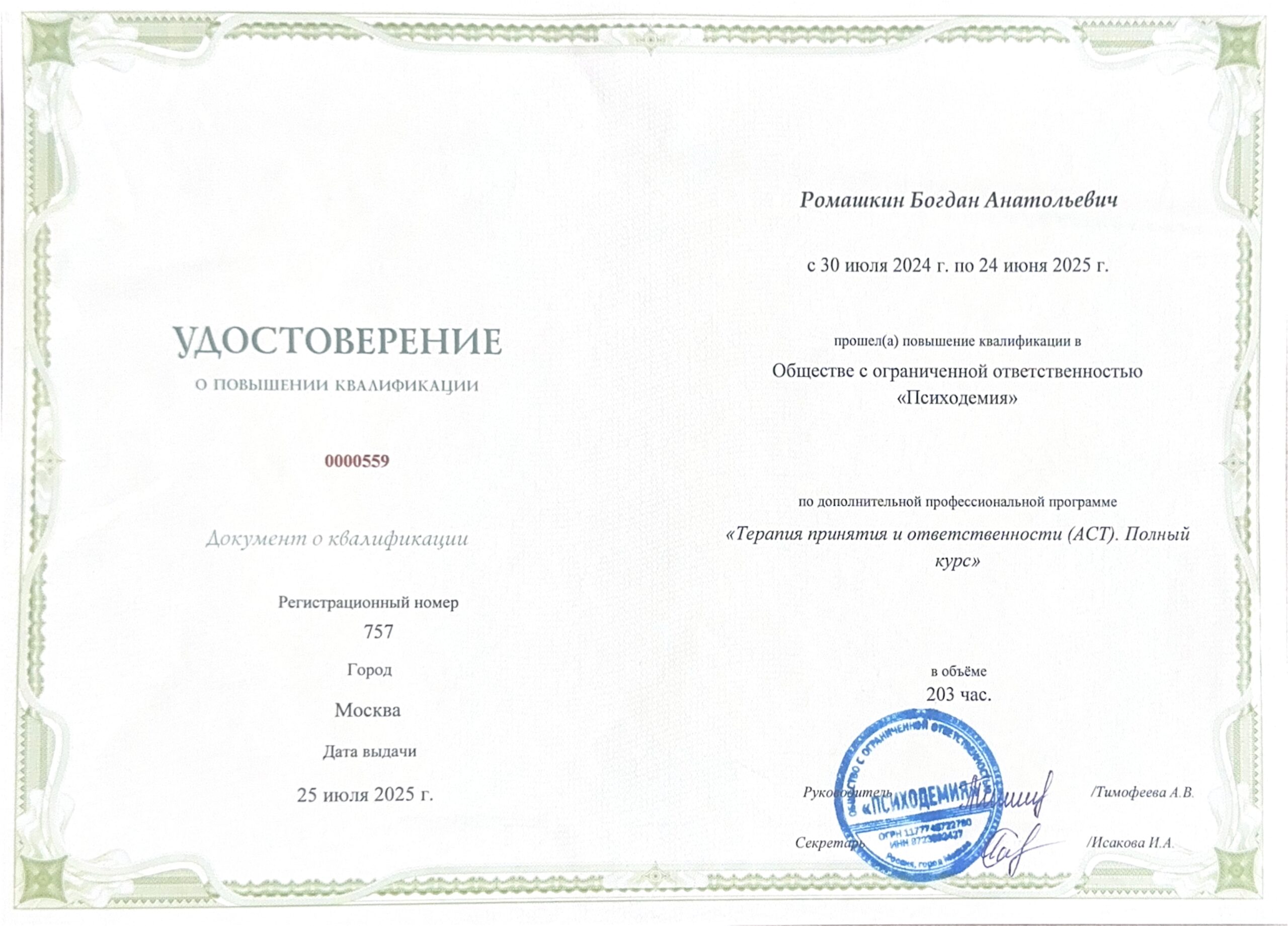 Методы работы:Когнитивно-поведенческая (КПТ) Терапия принятия и ответственности (ACT)
