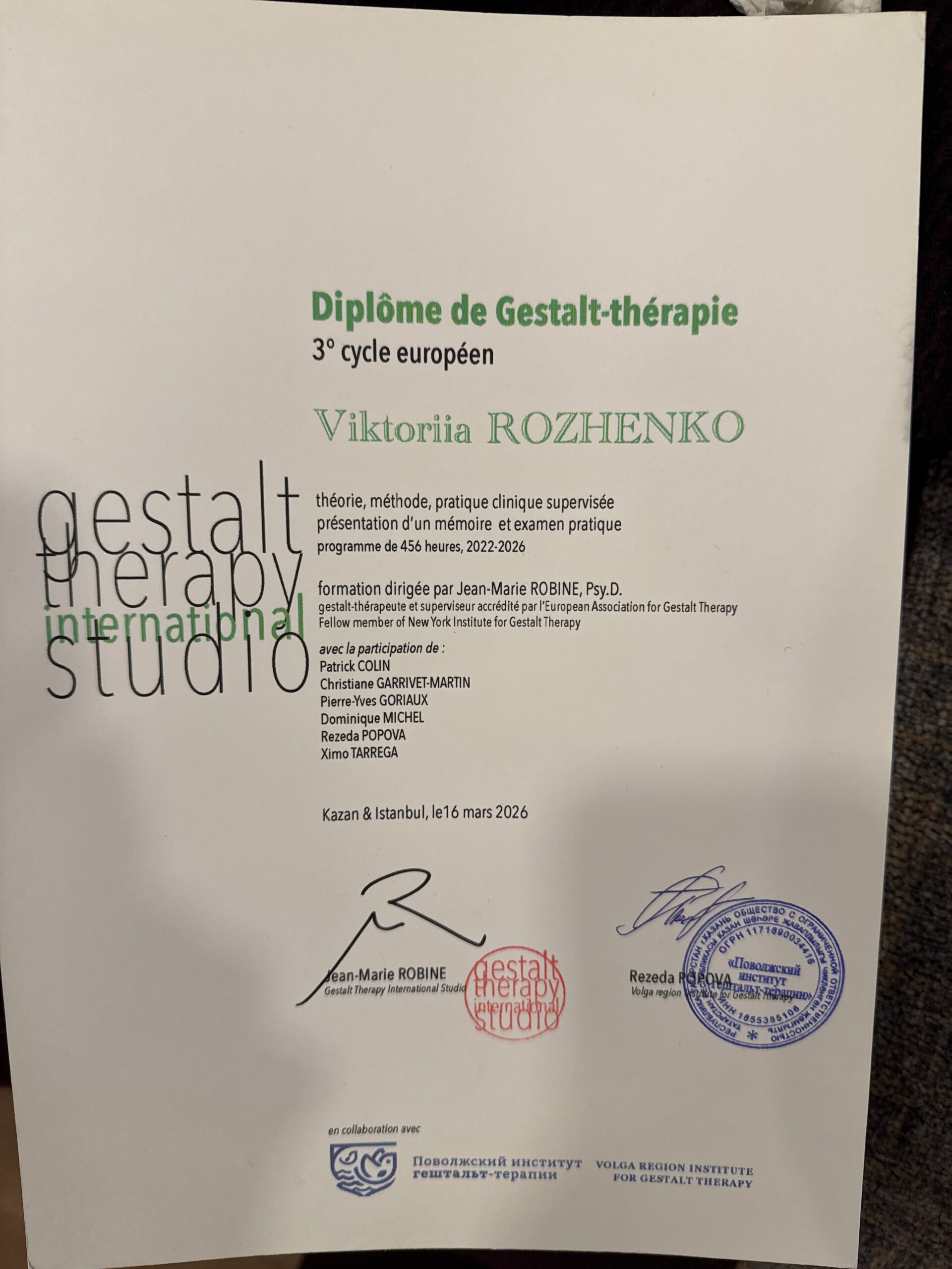 - Gestalt Therapy International Studio. 3rd cycle european and post-graduate program под руководством Jean-Marie Robine ( IFGT, France& VRIGT, Kazan & Istanbul, 2022-2026 г.г.)