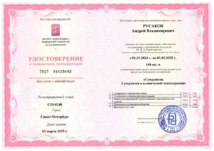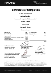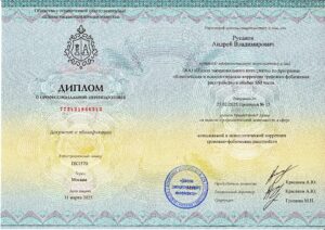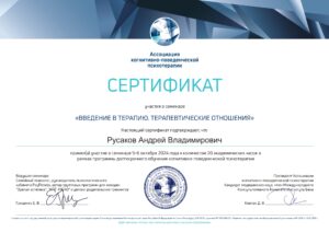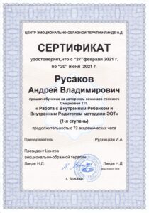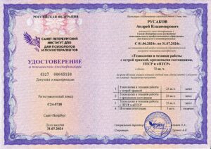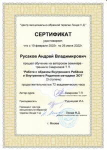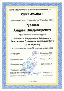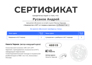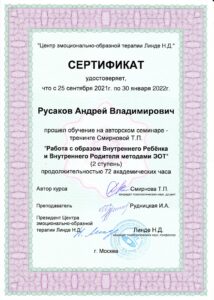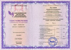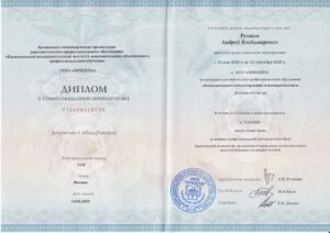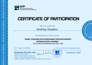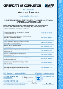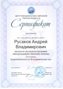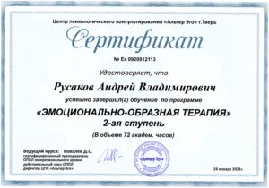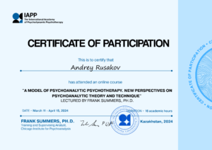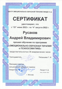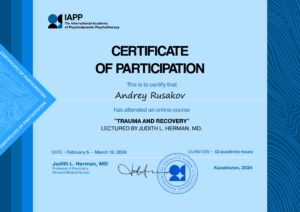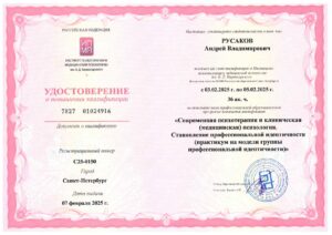 Хоть я и получил диплом бакалавра психологии с отличием, считаю, что высшего образования недостаточно для ведения частной практики, так же, как и освоения одного метода, поэтому продолжаю проходить повышения квалификации и переподготовку, в том числе и долгосрочную с личной терапией и супервизиями у российских и зарубежных специалистов из США, Великобритании, Австрии и Германии.