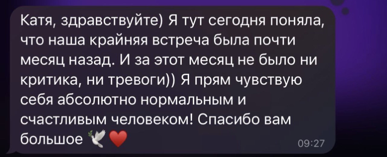 Здравстуйте, меня зовут Екатерина и я клинический психолог, и моя задача — помогать людям находить внутреннюю опору и возвращать управление своей жизнью. Я верю, что психотерапия — это совместное путешествие, где я выступаю в роли опытного проводника, а вы — главный эксперт в своей жизни.
