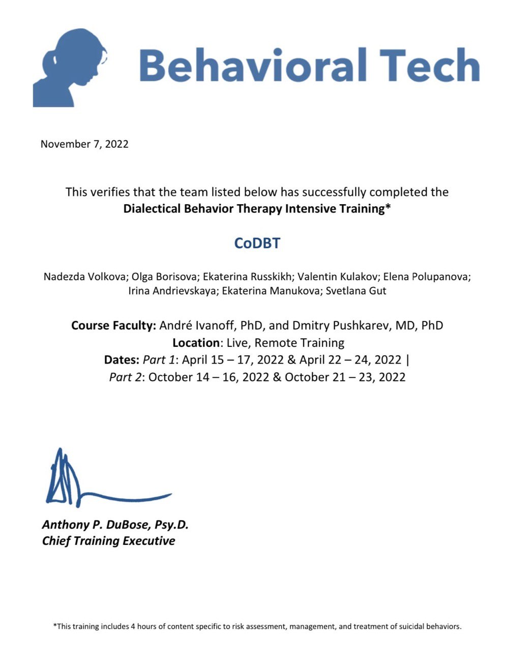 Методы работы:Диалектическая поведенческая терапия (DBT) Когнитивно-поведенческая (КПТ) Основанная на осознанности когнитивная терапия (MBCT) Схема-терапия