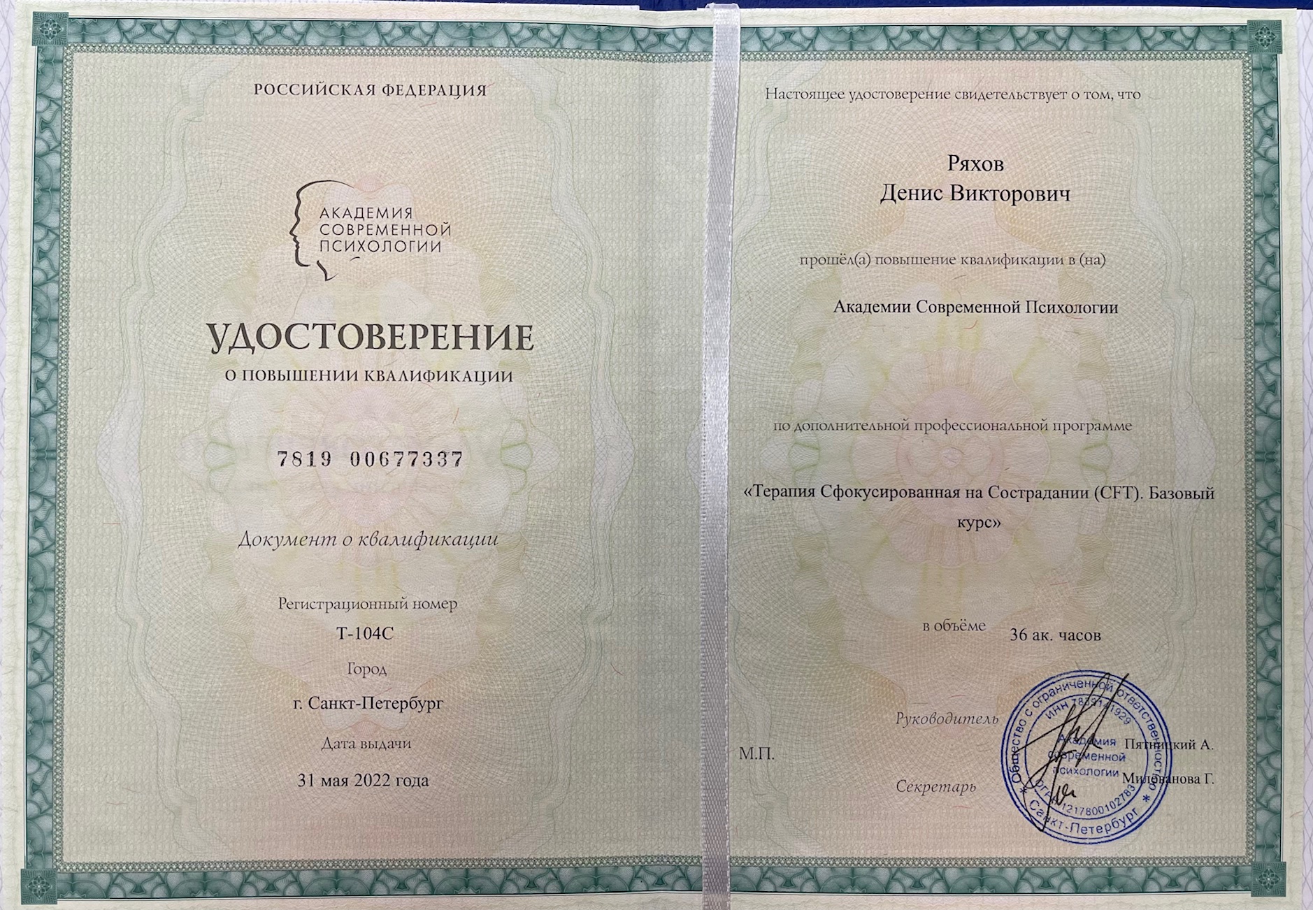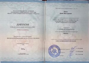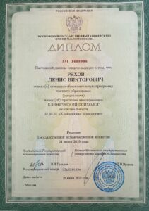 Базовое психологическое образование я получил на Факультете психологии МГУ им. М.В. Ломоносова (специальность: Клиническая психология, специализация: Психотерапия и психоаналитическая психология). Прошел повышение квалификации в Академии современной психологии (Терапия Сфокусированная на сострадании) и переподготовку в Институте Клиент-центрированной терапии и Фокусинга (Клиент-центрированная психотерапия).