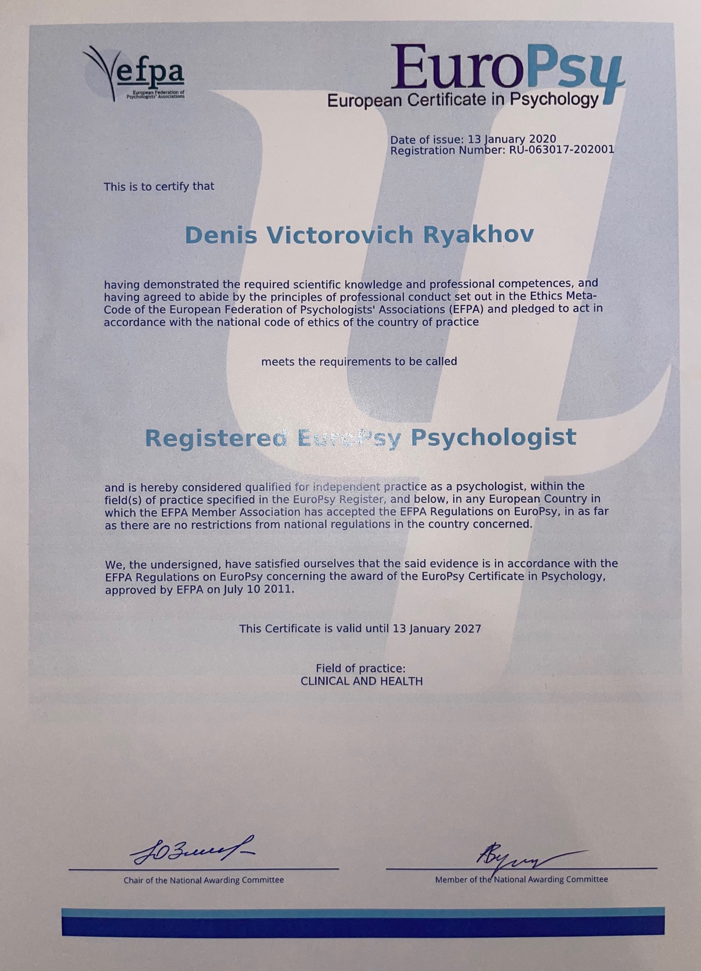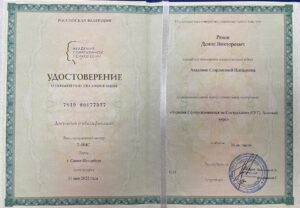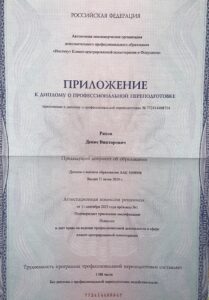 Являюсь полноправным членом Российского психологического общества (РПО), Профессионального сообщества клиент-центрированных психотерапевтов, имею профессиональную квалификацию Европейской федерации психологических ассоциаций (EFPA). Прошел более 800 часов личной терапии и более 1000 часов супервизий и интервизий различной направленности. Частной практикой занимаюсь с 2013 года.