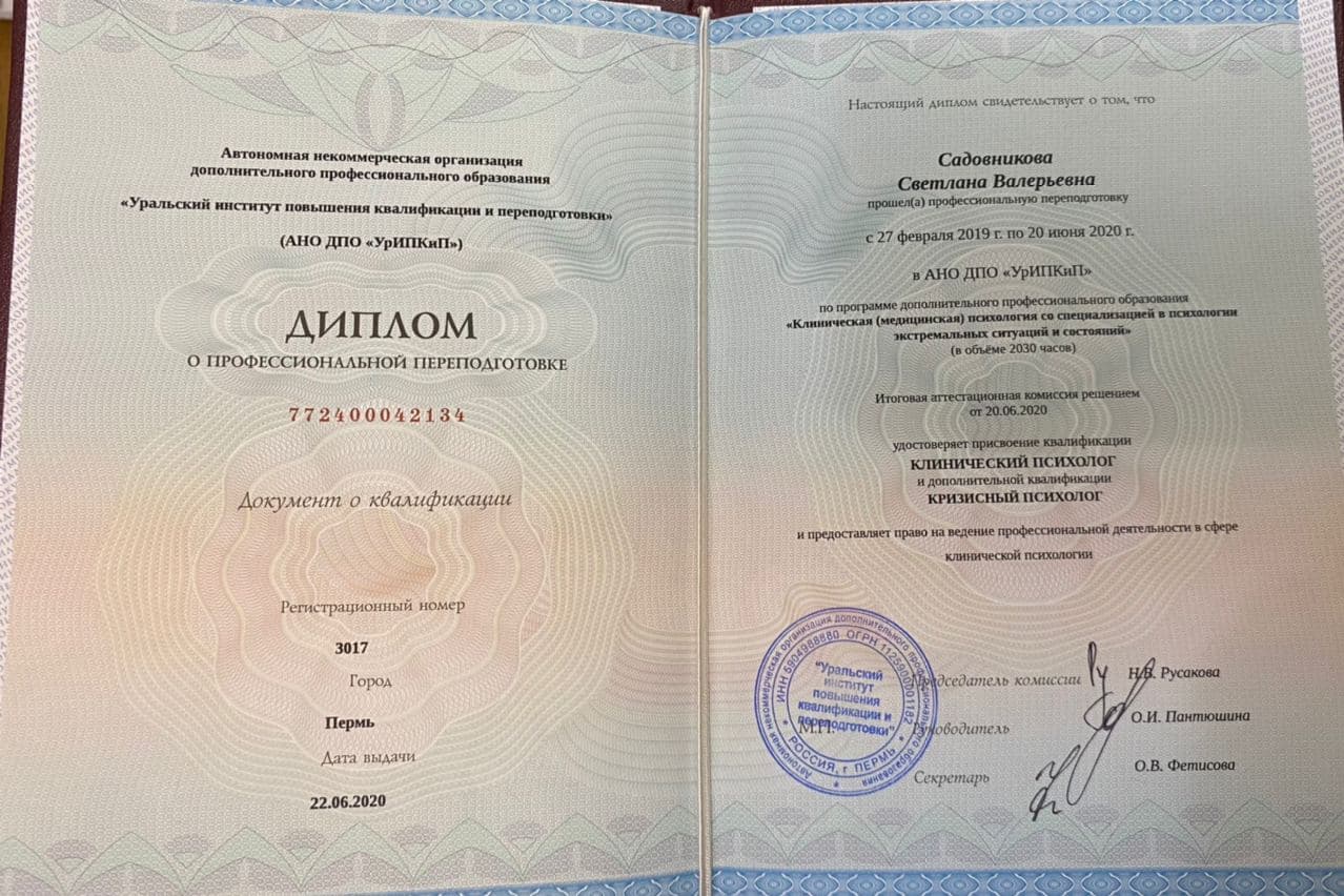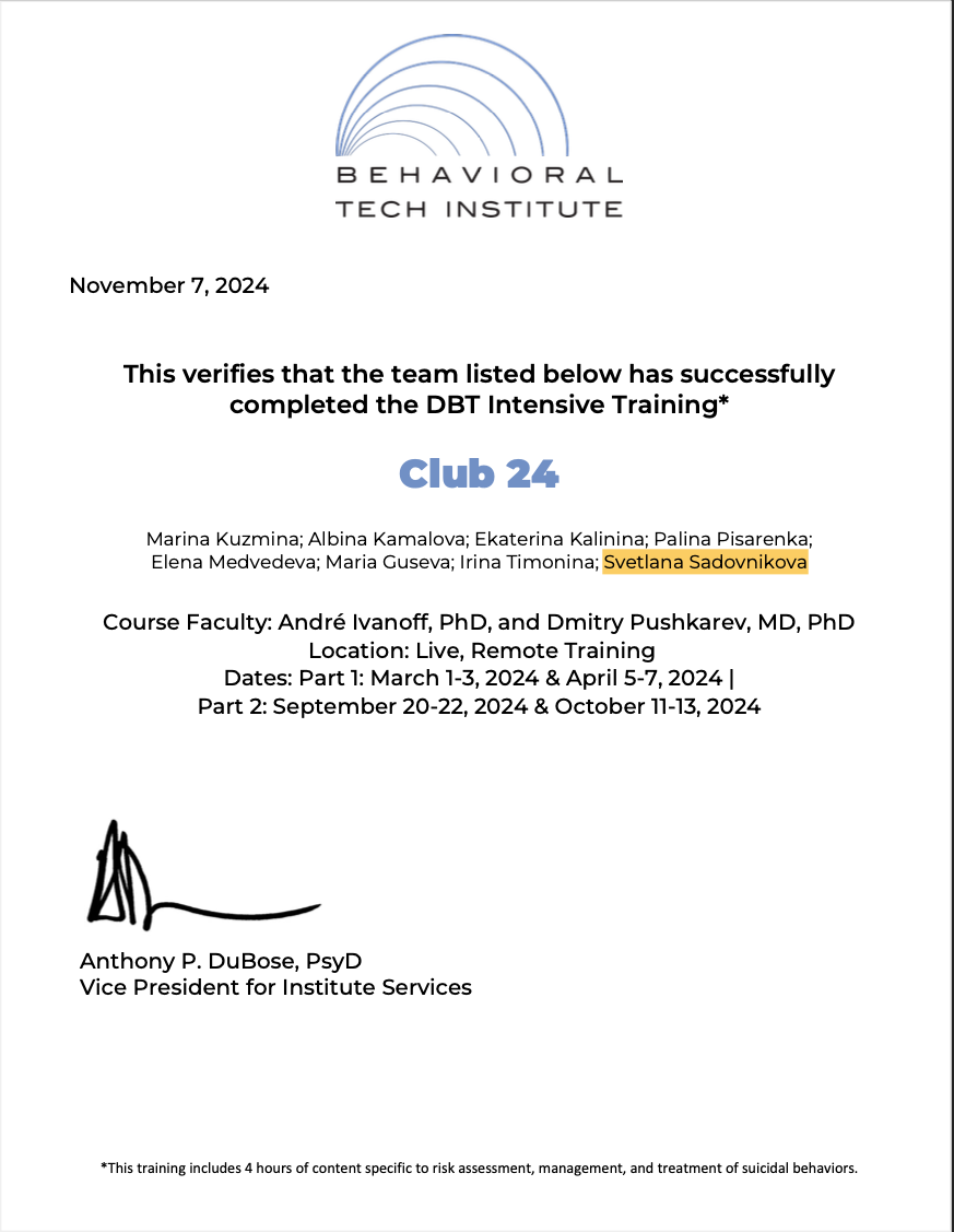 Методы работы:EMDR (ДПДГ) Диалектическая поведенческая терапия (DBT) Когнитивно-поведенческая (КПТ)