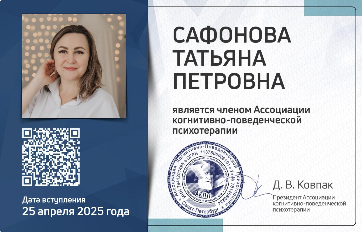 - когнитивно-поведенческая психотерапия (КПТ). Это один из научно доказанных и экспериментально обоснованных подходов, который признается экспертами во всем мире. Я являюсь членом Ассоциации Когнитивно-поведенческой психотерапии.