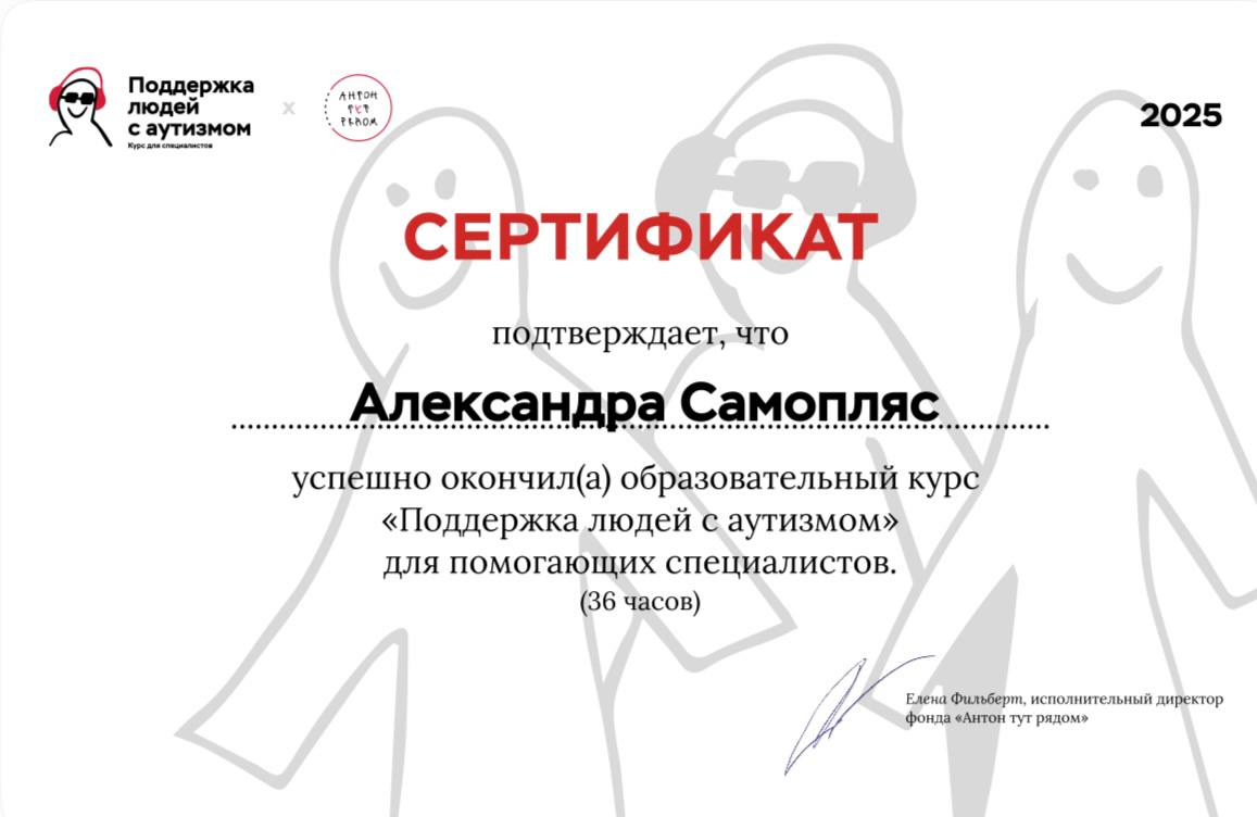 Приветствую! Меня зовут Александра, я магистр психологии, психолог в подходах ACT и когнитивно-поведенческой терапии. С 2019 года работаю со взрослыми — помогаю разбираться с тревогой, критикой, потерянностью, а главное — с поиском себя и построением личных границ. Также работаю со взрослыми людьми с расстройствами аутистического спектра (РАС).