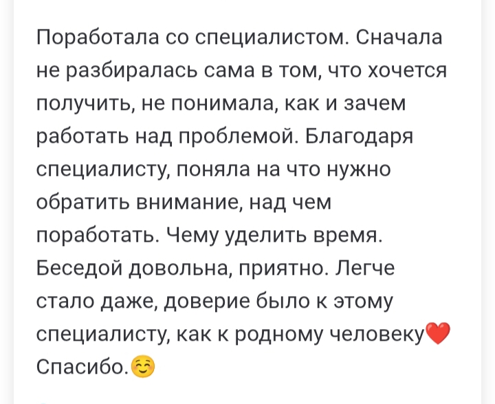 Не стесняйтесь обращайтесь за помощью. Я очень понимающий психолог. Общаясь со мной вы получите принятие и поддержку.