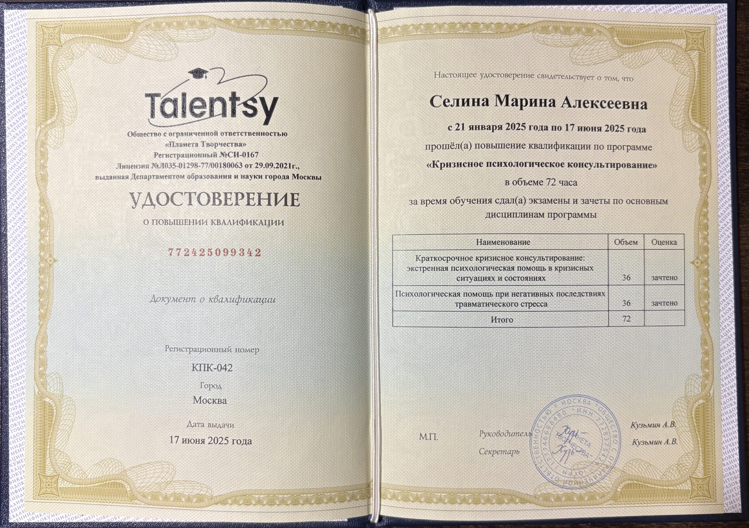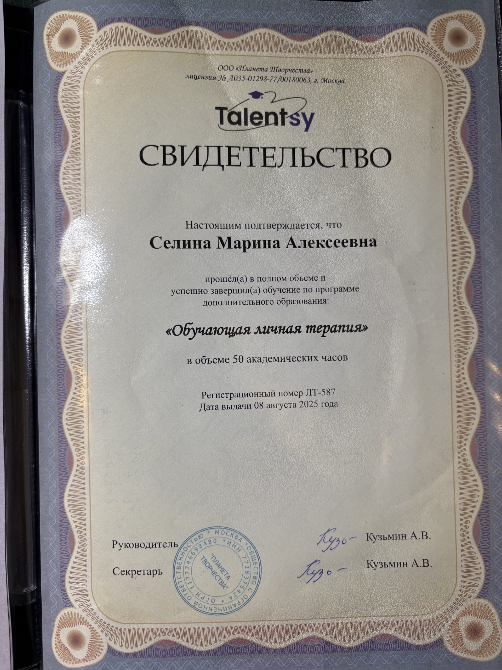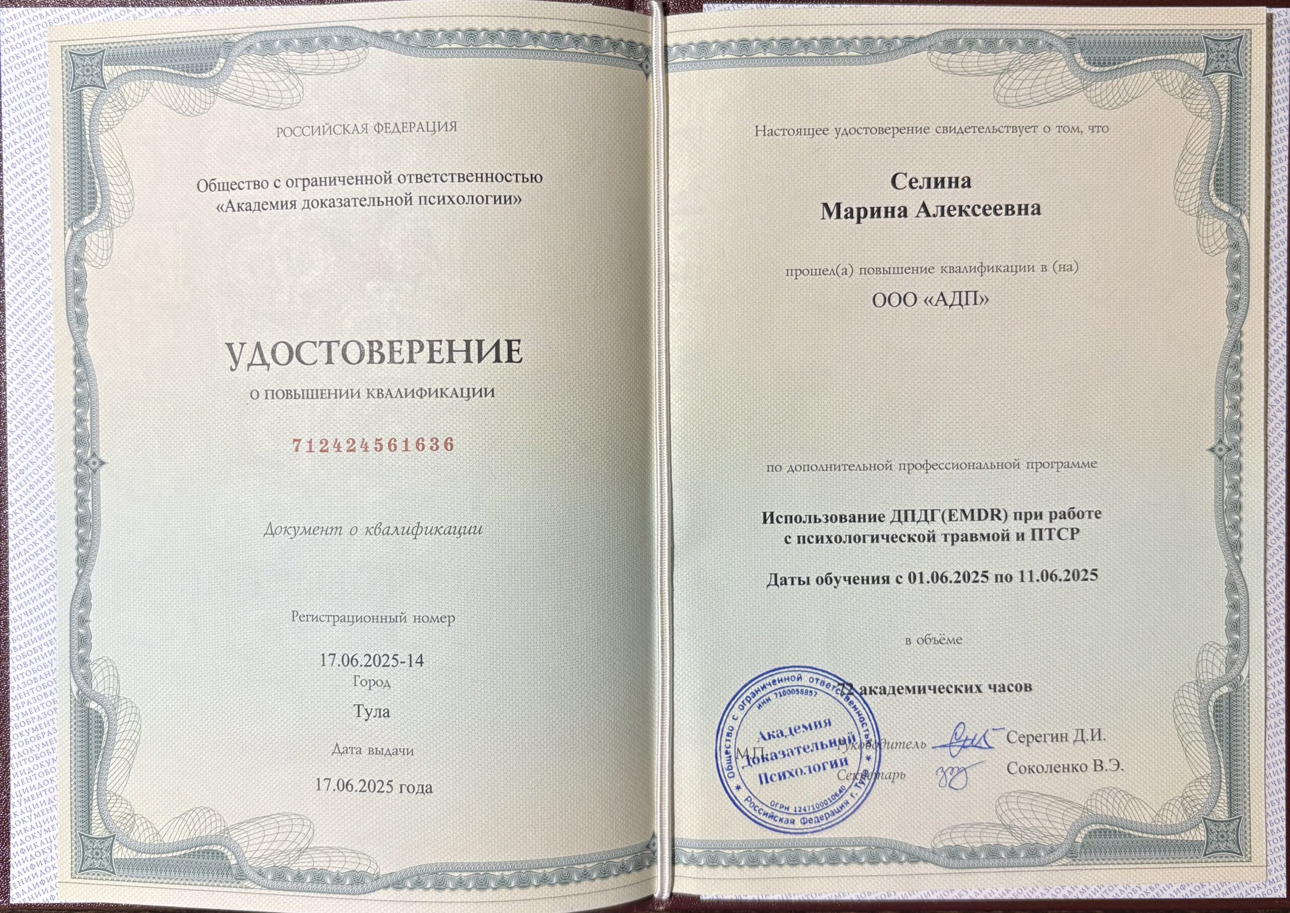 Методы работы:EMDR (ДПДГ) Гештальт-терапия Интегративный (смешанный) подход Основанная на осознанности когнитивная терапия (MBCT) Терапия внутренних семейных систем (IFS) Терапия принятия и ответственности (ACT) Терапия, сфокусированная на сострадании (CFT)