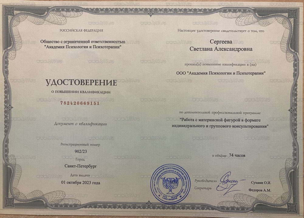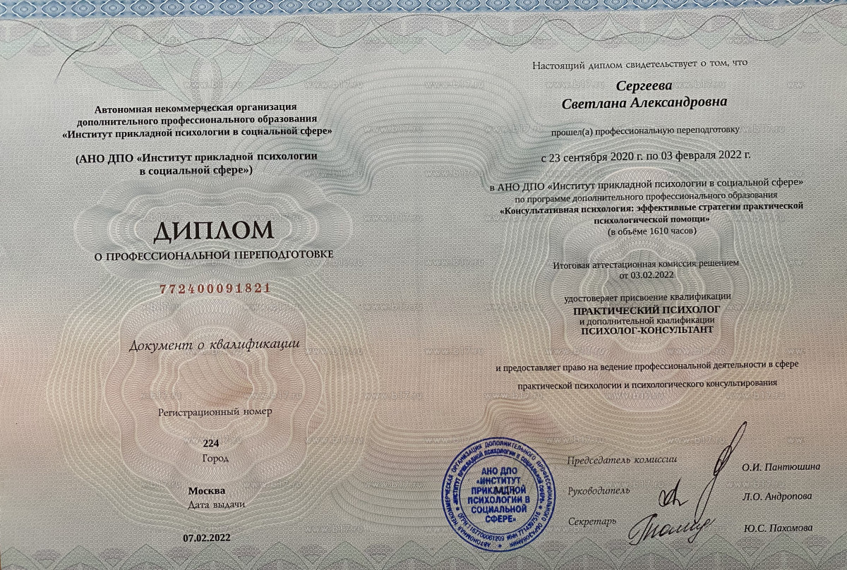У меня есть опыт прохождения личной и групповой терапии и супервизии. Я общаюсь с коллегами, состою в профессиональном сообществе, и знаю актуальную ситуацию в сфере психологии. В нашем общении вас ждет безопасное, конфиденциальное пространство, где вас выслушают без осуждения и оценок.