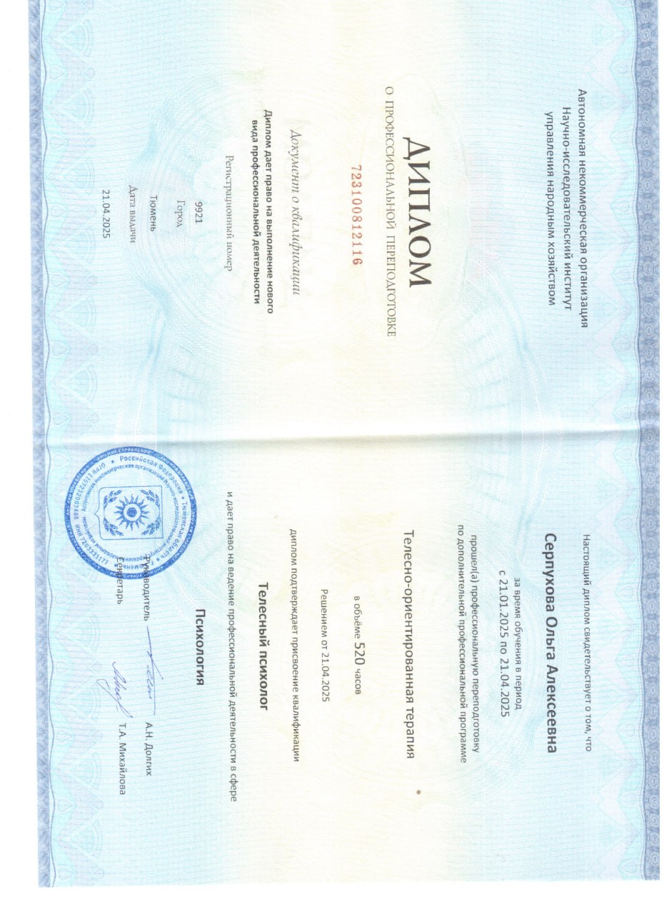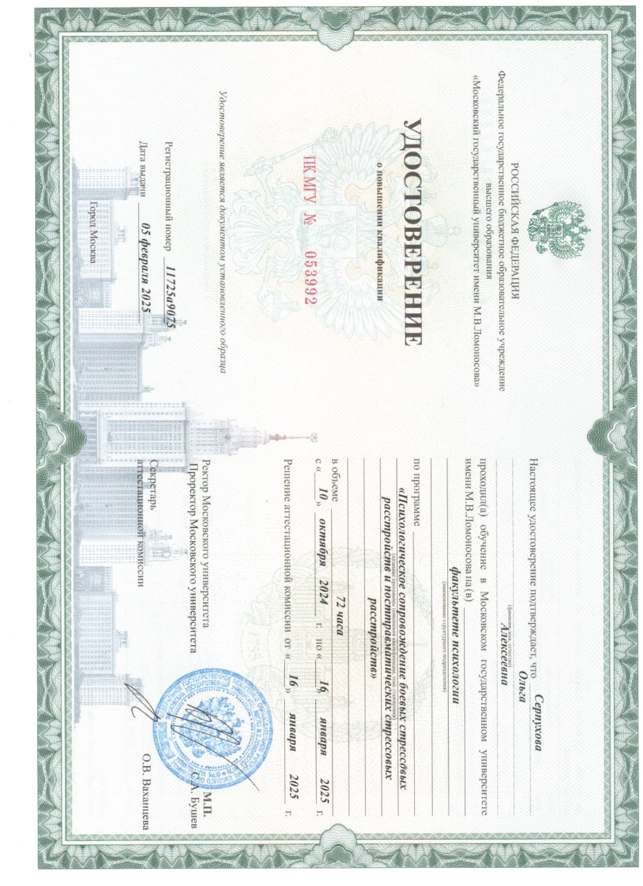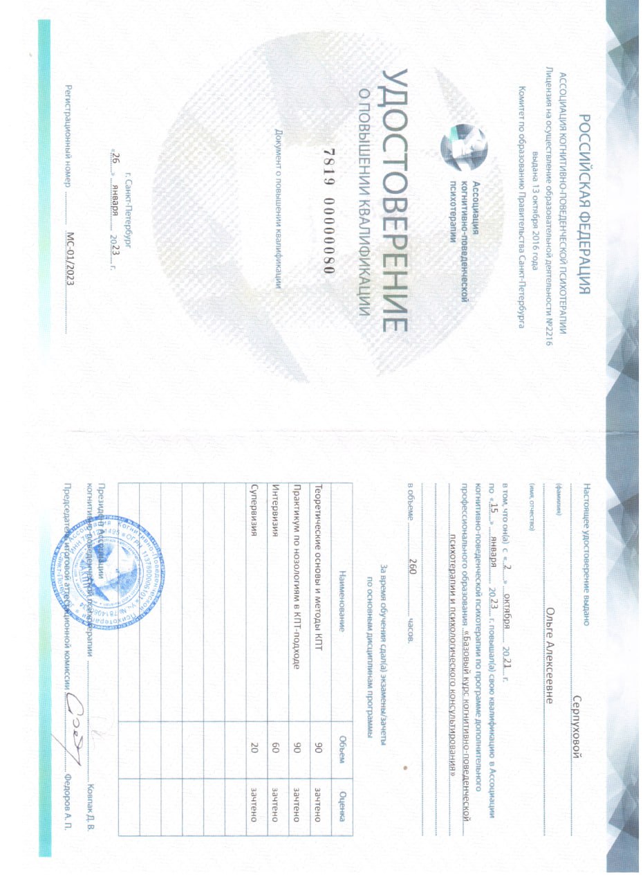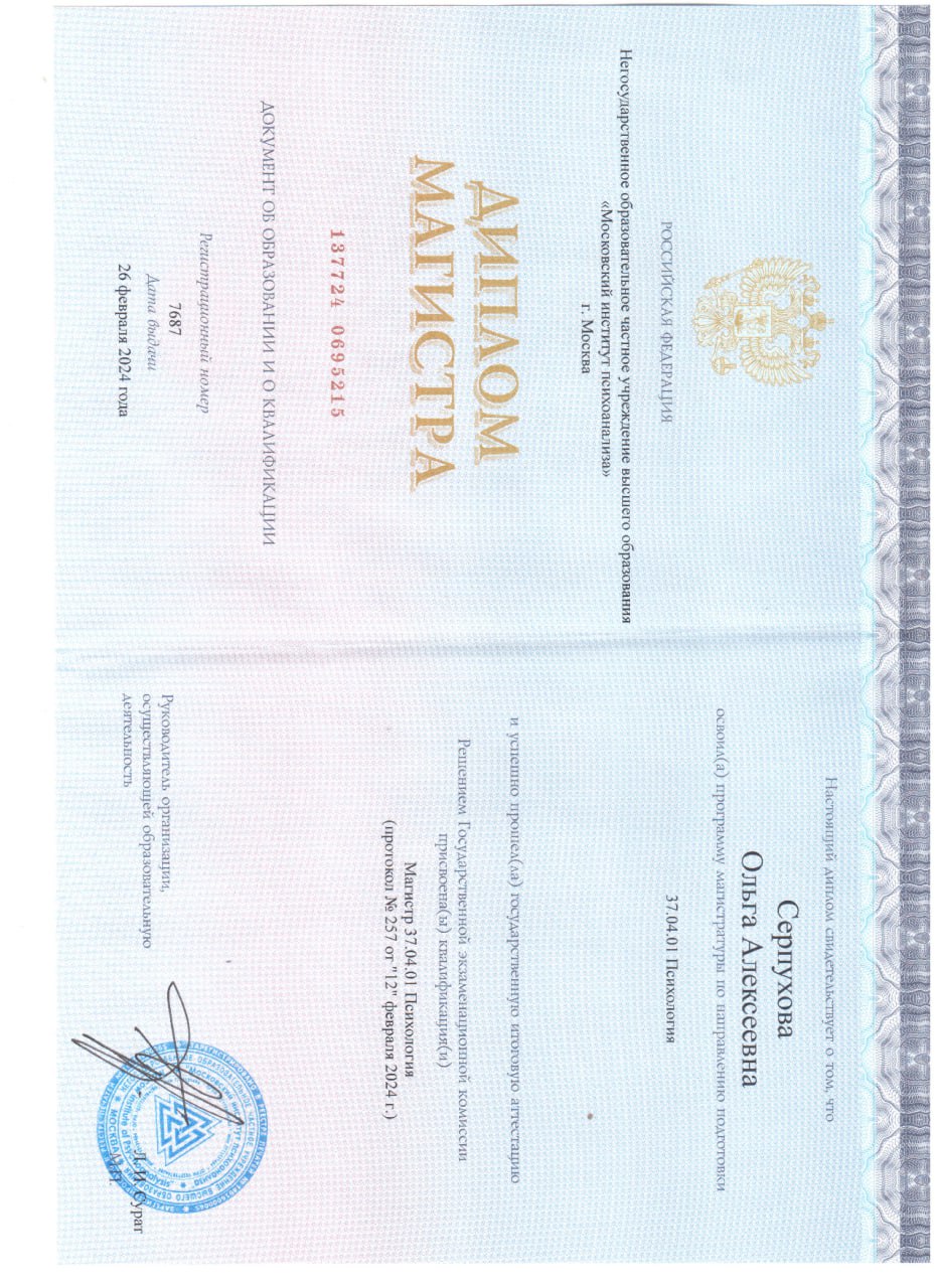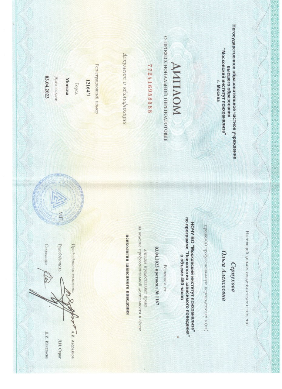 Окончила Московский Институт Психоанализа и прошла подготовку в Ассоциации Когнитивно-Поведенческой Психотерапии. Регулярно повышаю квалификацию и слежу за актуальными методиками в области КПТ.