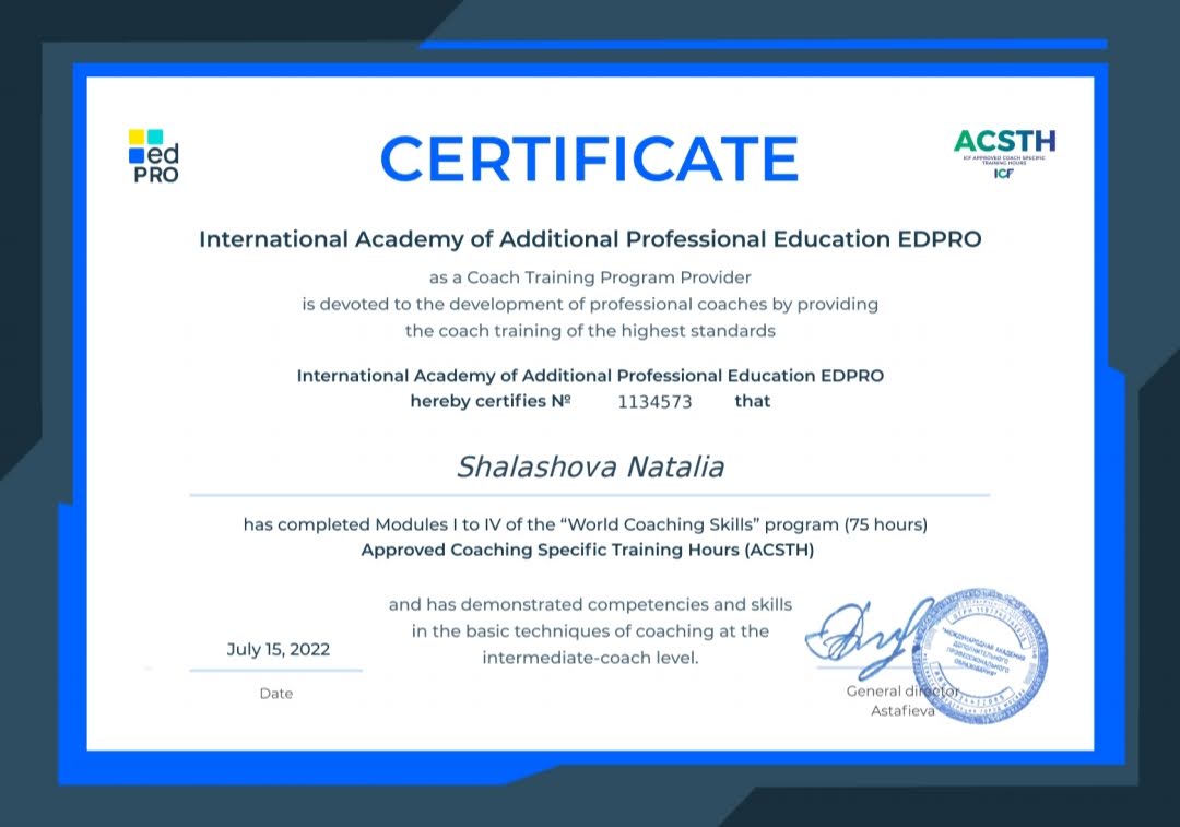 Мой инструментарий: 10+ лет в психологии, диплом БФУ им. Канта и сертификации от ведущих институтов (МГИ, статус КПТ-терапевта и коуча ICF). Но главное - я знаю, как применять эти знания (гештальт, КПТ, ДПДГ, МАК, коучинг) на практике, чтобы вы получали не просто поддержку, а реальный результат.