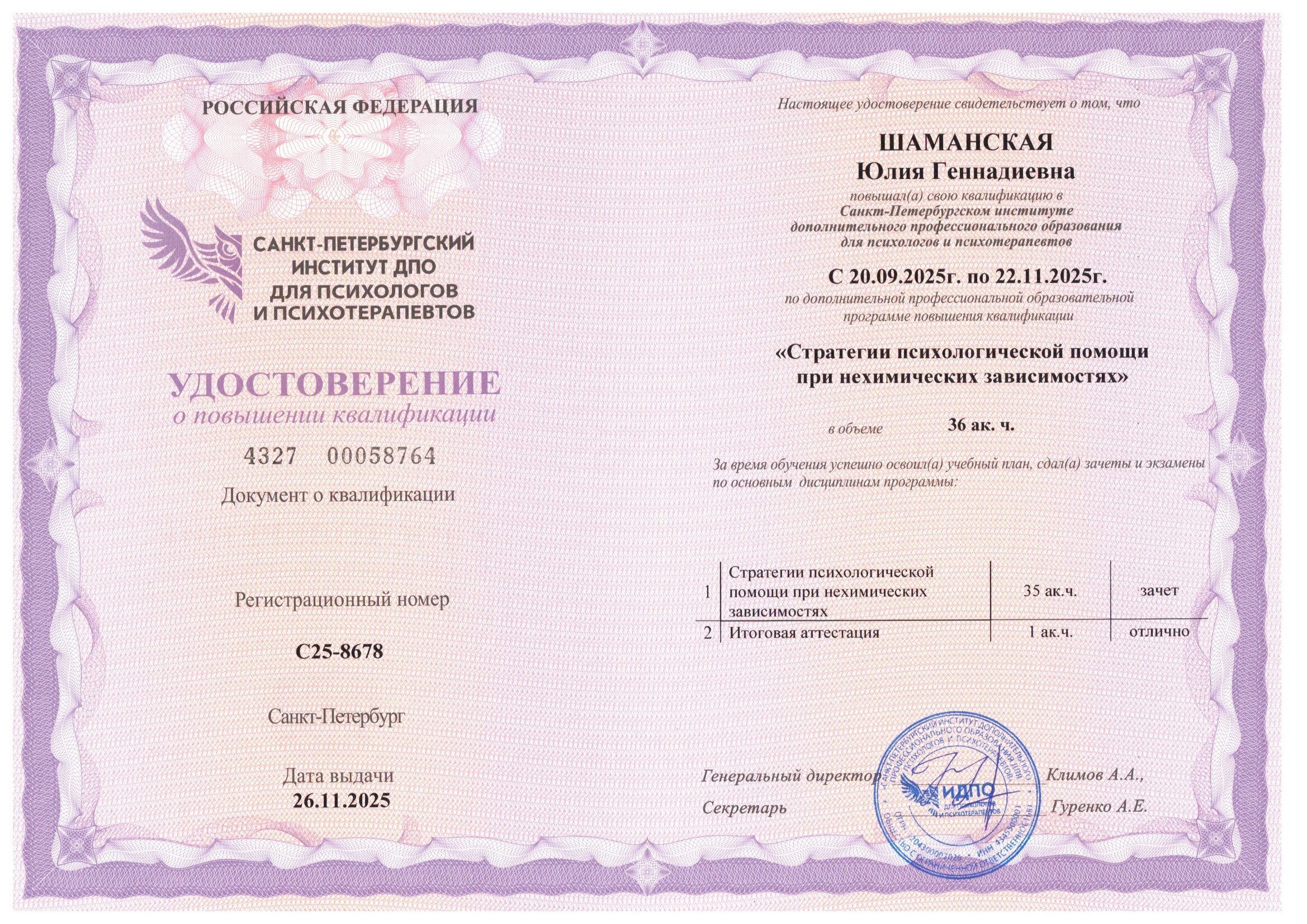 Имею необходимые, подтверждающие документы об образовании - представлены в профиле. В процессе получения степени магистр по специальности "Практическая социальная психология".