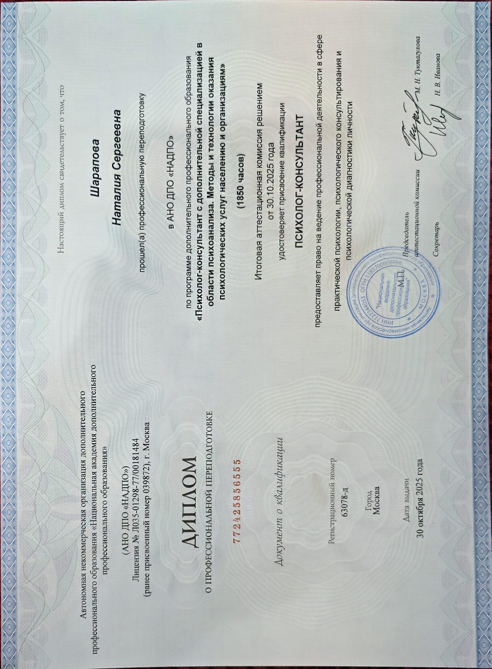 Я анализирую ситуацию – выявляю потребности, ценности и сильные стороны – разрабатываю стратегию – открываю путь к желаемым результатам клиента. Полная конфиденциальность и уважение к вашей уникальности гарантированы: все ваши переживания и мысли останутся строго между нами. Никакой критики: я не осуждаю, а направляю к позитивным переменам. Хотите лучше понимать и контролировать свои чувства? Мечтаете о большей уверенности в себе? Я приложу все усилия, чтобы вам помочь.